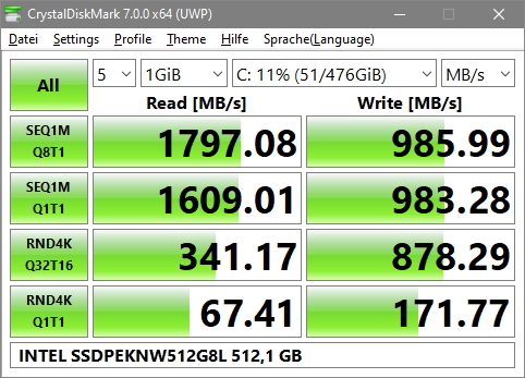 Die verbaute SSD unterstützt nur den PCIe der dritten Generation. Sie erreicht 1.797 MB/s im sequenziellen Lesen und 986 MB/s beim sequenziellen Schreiben. Die Angaben des Herstellers liegen bei 1.800 MB/s lesend und 1.000 MB/s schreibend. Damit erreichen wir also fast die Angaben des Herstellers.