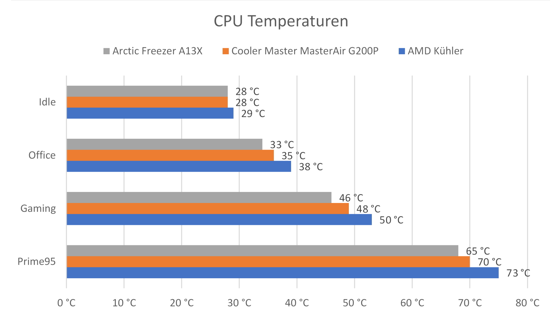 Um die Temperaturen des Mainboards bzw. die Effektivität der Kühler zu ermitteln, setzen wir Prime95 ein. Das Tool zur Auslastung der CPU lassen 15 Min. durchlaufen. Dabei beobachten wir die Werte der einzelnen Sensoren via HWinfo64 und nehmen die Temperatur mit einem Infrarot Thermometer direkt am Sockel ab. Als Kühler kommen neben dem original AMD Kühler noch ein Cooler Master G200P zum Einsatz, denn der ist für Mini-ITX Systeme gemacht und bietet sich daher sehr gut an. Auch der Arctic Freezer A13X ist ein kleiner Turmkühler, der in viele, kleine Gehäuse hineinpasst. Die Umgebungstemperatur beträgt während des Tests 23 °C. Die Lüftersteuerung überlassen wir dem Mainboard in der Einstellung „Balanced“.