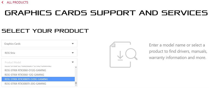 Jemand bei ASUS hat über die Feiertage wohl ein Glas Eierlikör zu viel getrunken, denn auf der Support-Website des Unternehmens sind im Pull-Down-Menü der Grafikkarten-Sektion zwei unveröffentlichte und unangekündigte Grafikkarten der GeForce RTX 30-Serie aufgeführt. Das wären die GeForce RTX 3080 Ti und die reguläre GeForce RTX 3060.