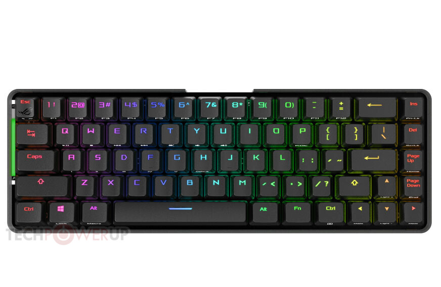 ASUS hat heute die ROG Falchion vorgestellt, eine drahtlose mechanische Gaming-Tastatur, die in den neuen „65%“-Formfaktor passt, der kleiner als TKL ist. Die Tastatur bietet 68 Tasten, wobei Makros und Funktionstasten das Defizit im Vergleich zu den meisten TKL- oder Standard-104-Tastaturen ausgleichen. ASUS bietet Cherry MX-Schalter mit RGB-beleuchteten Tastenkappen und Farbanpassung pro Taste.