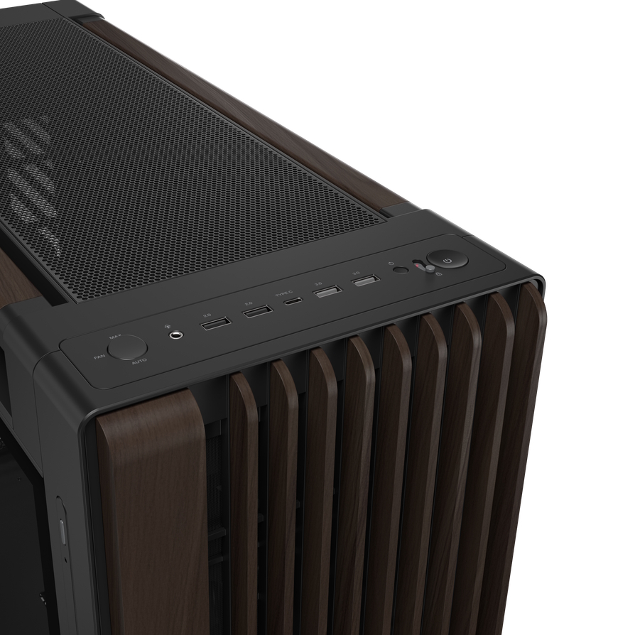Das markanteste Merkmal dieser Gehäuse bleibt das Frontpanel aus echtem Hartholz, das gegen Hitze und Feuchtigkeit behandelt wurde. Das Holz ist zu einem offenen Gitterdesign gefräst, das nicht nur eine hervorragende Luftzirkulation ermöglicht, sondern auch eine einzigartige Optik bietet, die sich deutlich von typischen Gaming-Gehäusen abhebt.