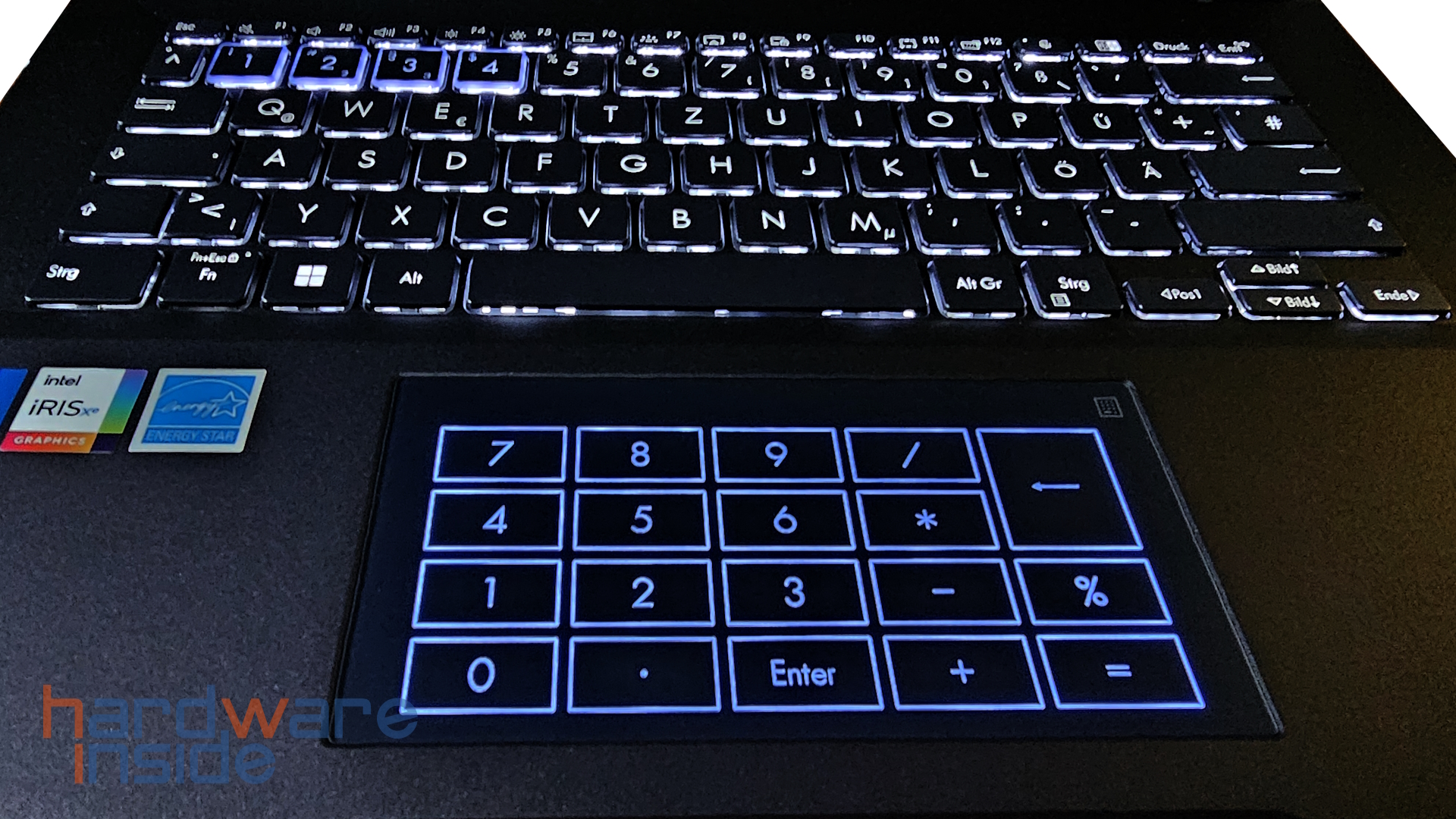 Aufgeklappt erwartet uns das 14“ große Display. Die Auflösung liegt hier bei 1.920 x 1.080 Pixel im 16:9 Format. An den Seiten sind die Ränder mit 5 mm recht dünn, während die Ränder ober- und unterhalb des Bildschirms größer ausfallen. Oberhalb des Bildschirms ist die Full-HD Webcam eingelassen, die über eine Kameraabdeckung verfügt, welche sich bei Bedarf zuschieben lässt. Insgesamt hätte man hier einen größeren Bildschirm verbauen können, das wäre nicht nur ein Mehrnutzen, es würde auch dem Design zugutekommen. In der unteren Hälfte erwartet uns eine Tastatur ohne Nummernblock, aber immerhin mit Pfeiltasten. Die Tasten sind dabei in einer ordentlichen Größe und zudem einfarbig (Weiß) hintergrundbeleuchtet. Darunter ist das Touchpad angeordnet, welches sich per Knopfdruck in ein Nummernblock nebst Zusatzfunktionen verwandelt. Ist die Funktion deaktiviert, so ist sie nicht sichtbar, erst wenn die Funktion eingeschaltet wird, erscheinen die „Tasten“ auf dem Touchpad.