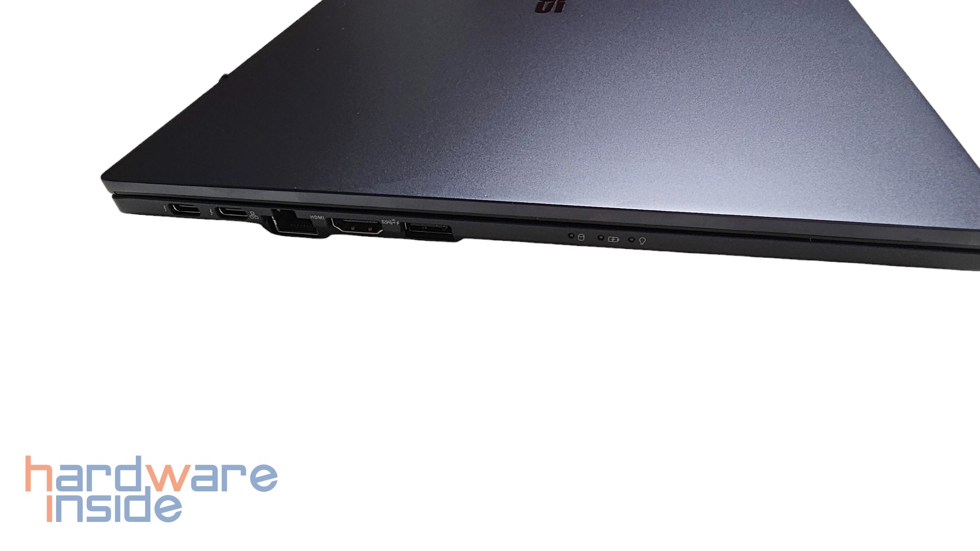 Nun sehen wir uns die linke Seite genauer an, denn diese verfügt über einige Anschlüsse. Hier finden wir zunächst zwei Thunderbolt 4 Anschlüsse, welche auch mit dem USB-Typ-C-Standard kompatibel sind. Über diese lassen sich Datenübertragungsraten von bis zu 40 Gbit/s erreichen. Über diese Anschlüsse können mittels bestimmter Kabel auch Monitore angeschlossen werden. Beide Anschlüsse können auch für das Laden des Notebooks genutzt werden. Weiter folgen ein RJ45-Netzwerkanschluss, ein HDMI-Ausgang sowie ein USB 3.2 (Gen2) Anschluss mit Ladefunktion – daher kann das Notebook auch über diesen Anschluss geladen werden. Ansonsten befinden sich hier noch die Statusanzeigen für die Laufwerksaktivität und den Akkuladezustand.