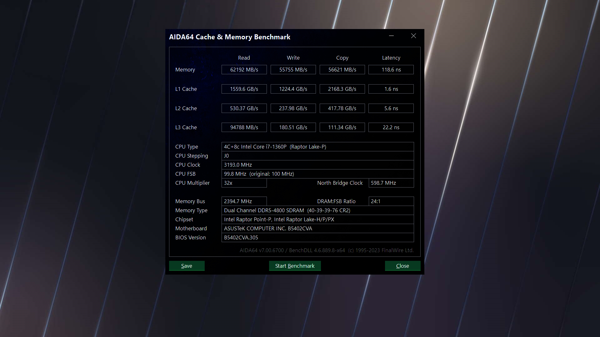 Beim Arbeitsspeicher arbeitet man physisch mit zwei DDR5-4800 SODIMM Modulen. Dabei ist eines aber fest mit dem Mainboard verlötet und das andere ist gesteckt und lässt sich austauschen. So kann der Speicher um ein bis zu 32 GB großes Modul ausgetauscht werden. Wichtig ist hier, dass das neue Modul dann die gleichen Timings und Taktung aufweist, da dies sonst zu Problemen führen kann. Die Timings des verbauten Speichers zeigt und die Software AIDA64 mit 40-39-39-76 CR2 an. Klar ist, dass man von diesem Arbeitsspeicher keine Zauberei erwarten kann, dementsprechend fällt auch der Leistungstest von AIDA64 aus. Die Leistung reicht für die meisten Anwendungen im Office- und Multimediabereich.