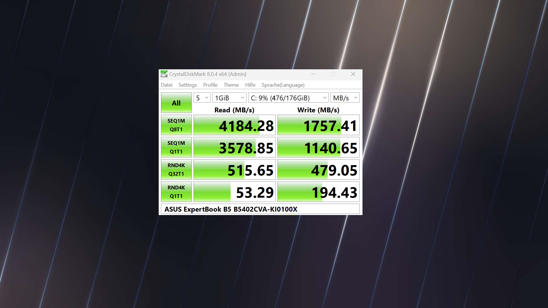 Verbaut ist ab Werk eine PCIe 4.0 SSD, welche über einen M.2 Anschluss angeschlossen ist. Dabei handelt es sich um eine Micron SSD der Serie 2400, welche laut Datenblatt bis zu 4.200 MB/s im sequenziellen Lesen und bis zu 1.800 MB/s im sequenziellen Schreiben schaffen sollte. Wir testen die Leistung mit dem CrystalDiskMark. Hier erreicht die SSD auch nahezu die Leistungsangaben des Herstellers, sodass die angesprochene Zielgruppe mit dieser Leistung gut zurechtkommen sollte. Das Notebook unterstützt übrigens auch einige RAID Konfigurationen, so dass man mittels einer weiteren, vom Speicherplatz gleichen SSD hier einen RAID-Verbund erstellen kann, um entweder die Leistung zu erhöhen oder um eine Redundanz zu erreichen.