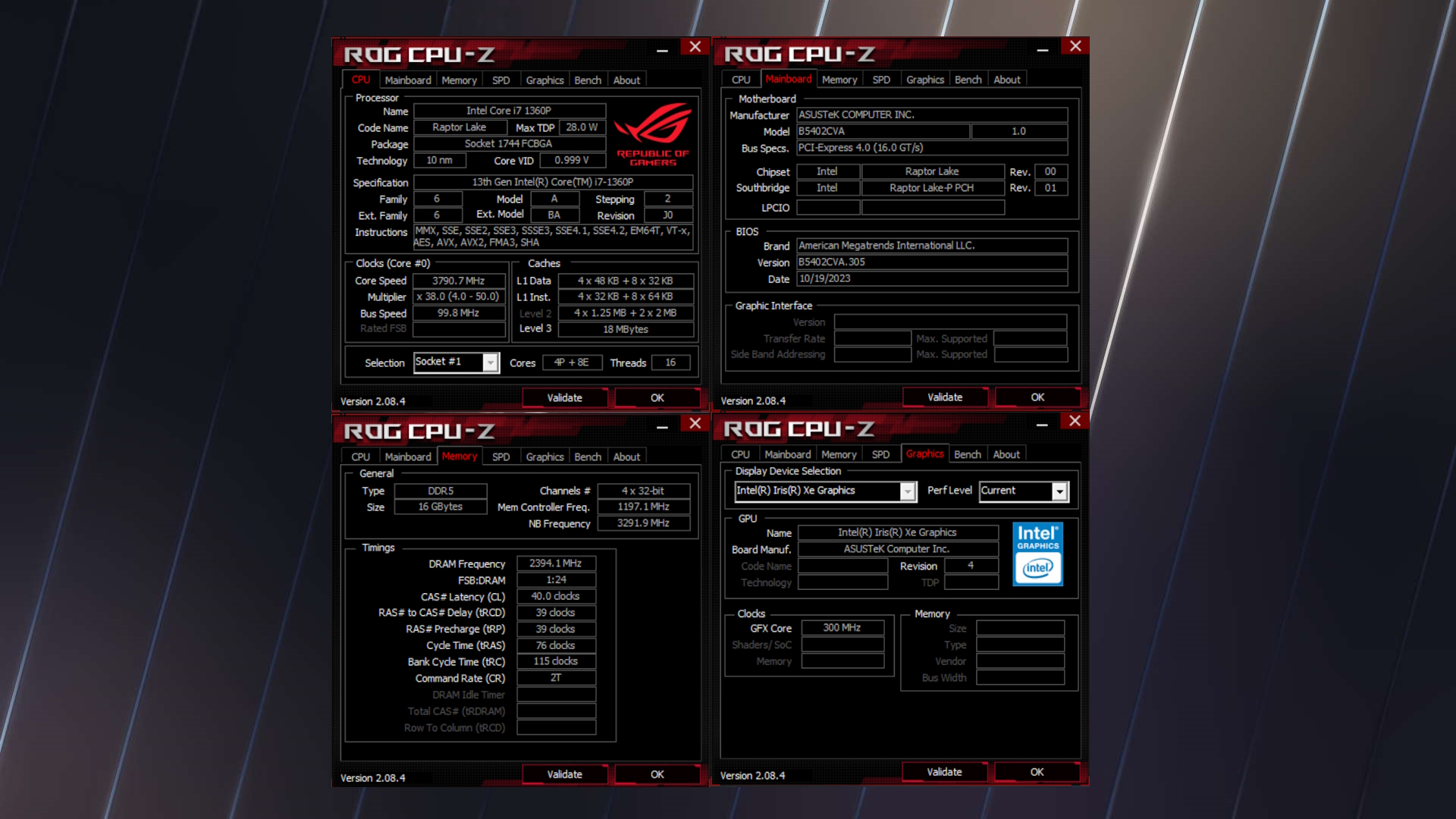 Mit dem kleinen Tool namens CPU-Z validieren wir die Daten zum ASUS ExpertBook B5. Hier sehen wir, dass es sich um ein Model mit Intel Core i7-1360P handelt. Dieser verfügt über 4 Leistungskerne (P-Cores) und 8 Effizienzkerne (E-Cores) addiert ergeben sich damit 12 Kerne und 16 Threads. Aktuell taktet der Prozessor bei knapp 3,80 GHz. Beim Speicher wird uns die Gesamtkapazität von 16 GB angezeigt, der Arbeitsspeicher taktet mit 2.400 MHz – das ist gut zu wissen, wenn man mit dem Gedanken spielt den Arbeitsspeicher aufzurüsten. Die Grafikkarte ist hier im Prozessor enthalten, dabei handelt es sich um eine Intel Iris Xe, welche gerade bei 300 MHz taktet, bei Bedarf jedoch auf bis zu 1,5 GHz takten kann. Hier wird bis DirectX 12.1 und eine Auflösung von maximal 7.680 x 2.304 Pixeln bei 60 Hz unterstützt (an externen Monitoren). Die Grafik teilt sich den Arbeitsspeicher mit dem System-Arbeitsspeicher. Dabei können bis zu 64 MB fest über das BIOS zugewiesen werden, wird mehr Speicher benötigt, so holt sich das System diesen dynamisch vorm Arbeitsspeicher.