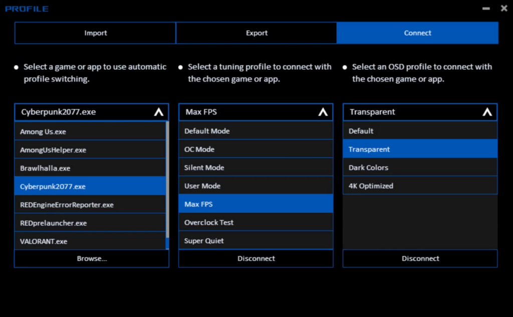 Games und Anwendungen haben unterschiedliche grafische Anforderungen, weshalb Overclocking-Tools die Möglichkeit bieten, mehrere Performance-Profile zu erstellen, die über Menütasten oder Hotkeys gewechselt werden können. Durch die neue Funktion “Profile Connect” bietet GPU Tweak III einen automatisierten Ansatz für die Profilverwaltung. Nach der Anpassung von Overclocking- oder Lüftereinstellungen kann ein Profil gespeichert und mit der gewünschten Programmdatei verknüpft werden, damit GPU Tweak automatisch die bevorzugten Einstellungen anwendet, wenn die zugewiesenen Spiele oder Anwendungen gestartet werden. Mit nur wenigen Vorbereitungen können Games für maximale FPS optimiert und Produktivitäts-Apps für ablenkungsfreies Arbeiten optimiert werden, ohne dass zusätzliche Handgriffe nötig sind.