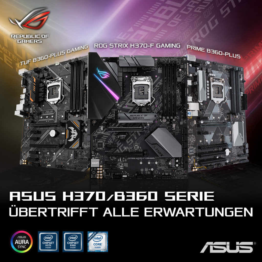 Die Mainboards ROG-Strix, TUF-Gaming und Prime-Serie sind ab sofort verfügbar. Die unverbindlichen Preisempfehlungen inclusive 19% Mehrwertsteuer betragen: ROG STRIX H370-F GAMING 149,49€ ROG STRIX H370-I GAMING 136,99€ TUF H370-PRO GAMING (WiFi) 137,99€ TUF H370-PRO GAMING 126,49€ PRIME H370-A 110,99€ PRIME H370-PLUS 105,49€ PRIME H370M-PLUS 103,49€ ROG STRIX B360-I GAMING 130,99€ ROG STRIX B360-F GAMING 126,49€ ROG STRIX B360-H GAMING 115,49€ TUF B360-PRO GAMING (WiFi) 115,49€ TUF B360-PRO GAMING 103,99€ ROG STRIX B360-G GAMING 99,49€ TUF B360M-PLUS GAMING 93,49€ TUF B360-PLUS GAMING 93,49€ PRIME B360-PLUS 86,49€ PRIME B360M-C 82,49€ TUF B360M-E GAMING 84,99€ PRIME B360M-A 76,99€ PRIME B360M-D 71,99€ PRIME B360M-K 67,99€ TUF H310-PLUS GAMING 87,99€ PRIME H310I-PLUS 72,99€ PRIME H310-PLUS 71,99€ TUF H310M-PLUS GAMING 74,49€ PRIME H310M-C 65,49€ PRIME H310M-A 62,99€ PRIME H310M-D 60,99€ PRIME H310M-E 59,99€ PRIME H310M-K 57,99€