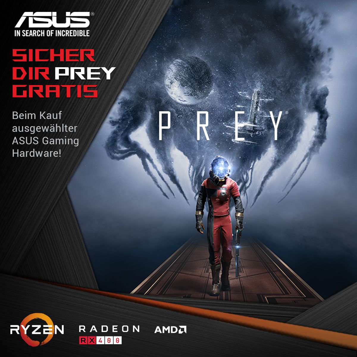 Ratingen, der 30. März 2017 – ASUS startet heute sein Grafikkarten- und Mainboard-Bundle mit dem mit Spannung erwarteten Sci-Fi-Actionspiel Prey®. Nach dem Kauf eines Aktionsprodukts bei einem teilnehmenden Händler, können Kunden aus Deutschland und Österreich einen Steam-Downloadcode für den kommenden Spiele-Hit der Arkane Studios anfordern. Zu den teilnehmenden Produkten gehören das ASUS Prime X370-Pro und ASUS ROG Crosshair VI Hero sowie ASUS-Grafikkarten der Strix- und Dual-Serie mit AMD RX 480 und RX 470-Grafikprozessor. Der Versand der Gamecodes erfolgt ab dem 5. Mai 2017 zum Release von Prey.