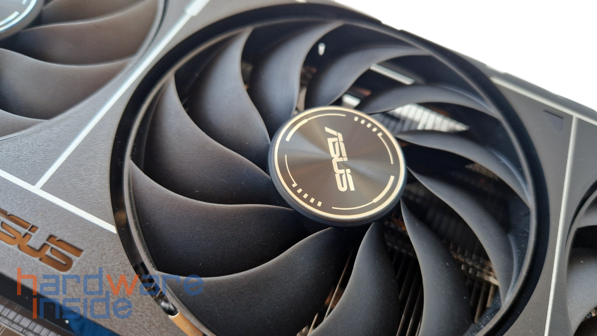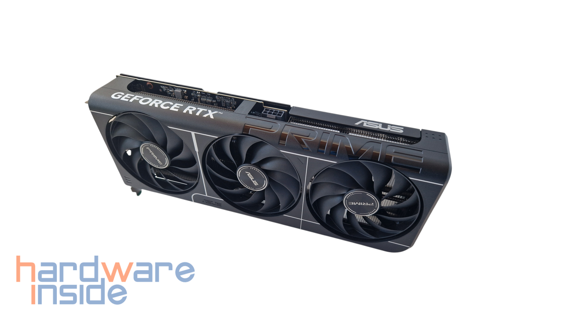 Die Vorderseite der ASUS PRIME GEFORCE RTX 5060 TI 16GB ist in einem dunklen Grau mit weißen Akzenten eher unauffällig gehalten und kommt ohne RGB-Elemente aus. Ein seitlich gut eingearbeiteter PRIME-Schriftzug rundet vorab stimmig das Gesamtbild ab. Ausgestattet mit drei Axial-Tech Lüftern von ASUS mit Dual-Ball-Lüfterlagern, die einen verbesserten Luftstrom mit geringerem Geräuschpegel bieten, wobei die Drehrichtung der beiden Außenlüftern gegen den Uhrzeigersinn gerichtet ist.