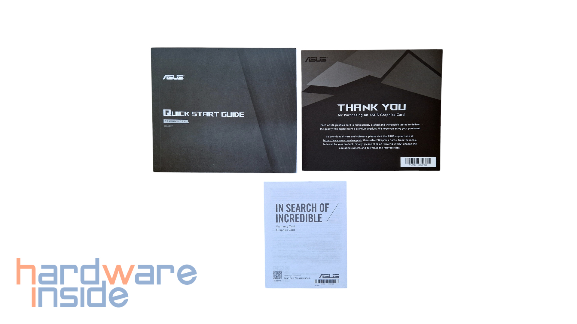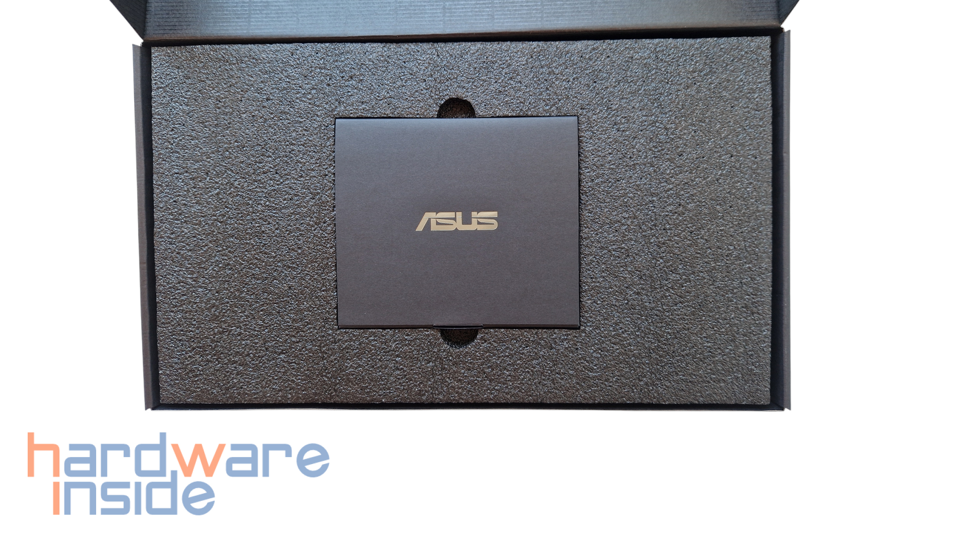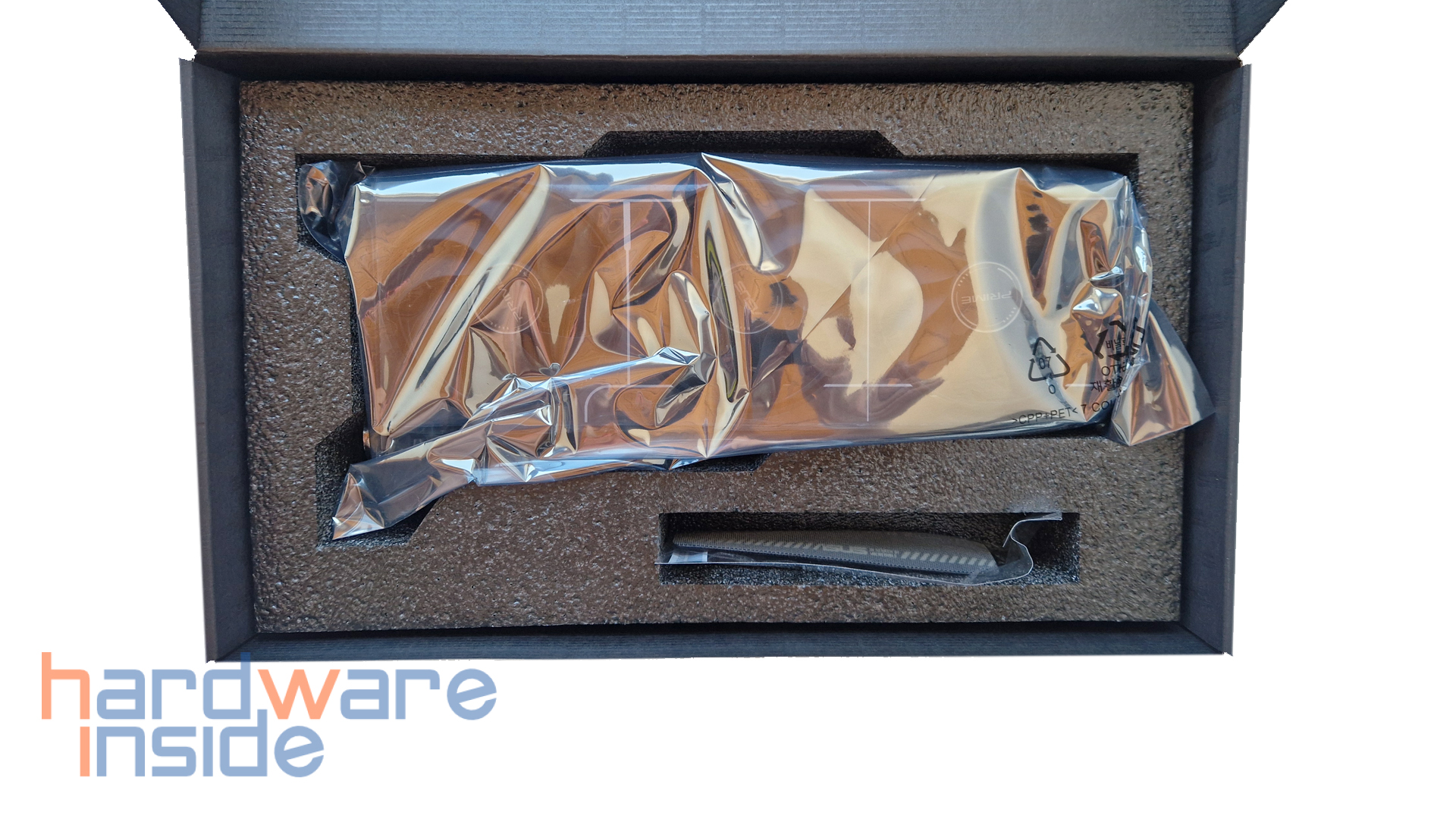 Im Inneren der Verpackung finden wir in einem schwarzen Schaumstoff-Inlay die Grafikkarte in einer antistatischen Tüte sicher verpackt. In einer kleinen schwarzen Kartonage mit goldfarbenem ASUS-Schriftzug befindet sich noch folgendes im Lieferumfang.