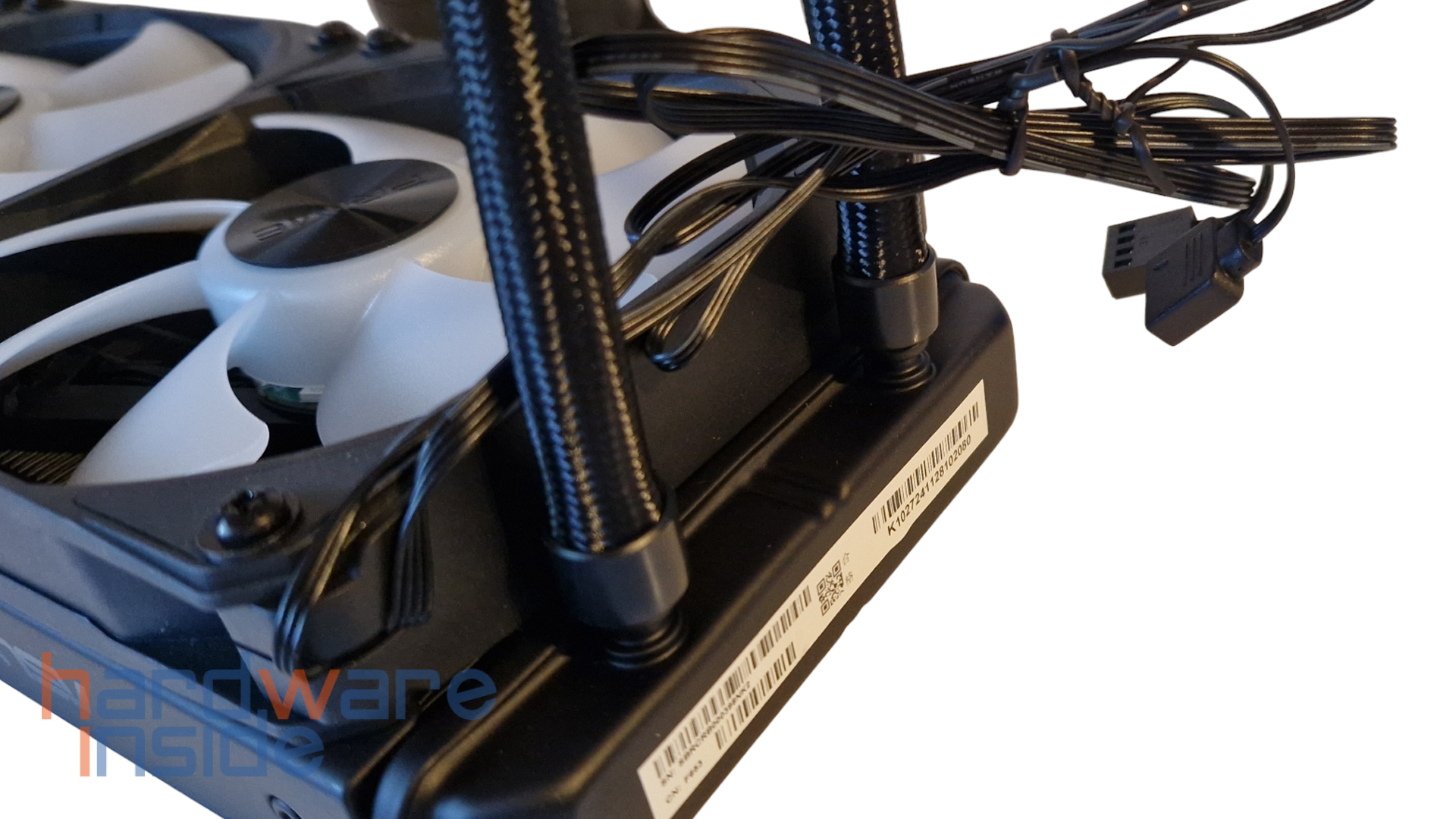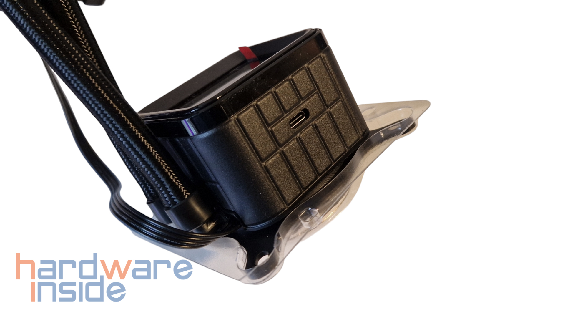 Oberhalb des Kühlergehäuses befindet sich ein USB-Typ-C Anschluss, welcher später mittels des im Lieferumfang enthaltenen USB TYP-C zu USB 2.0 Kabels als Verbindung zwischen AIO und Mainboard dient. Im Inneren kommt eine nicht unbekannte Pumpe der achten Generation von Asetek zum Einsatz. Laut Herstellerangaben arbeitet diese im Bereich von 800 bis 3600 RPM ±300 U/Min.