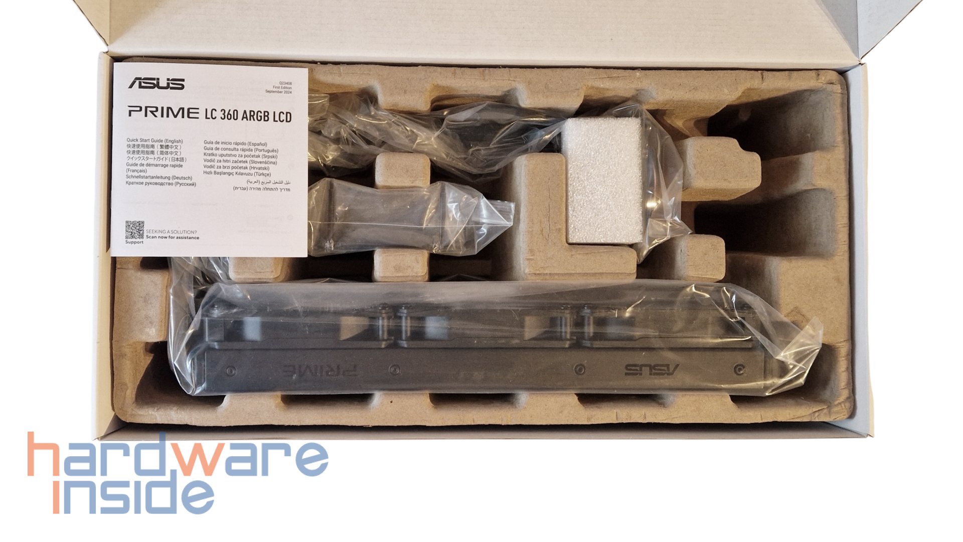 Auf einer der Stirnseiten wird in 10 Sprachen kurz auf ASUS AURA eingegangen und die andere Seite zeigt grafisch das beiliegende Zubehör der Prime LC 360 ARGB LCD.