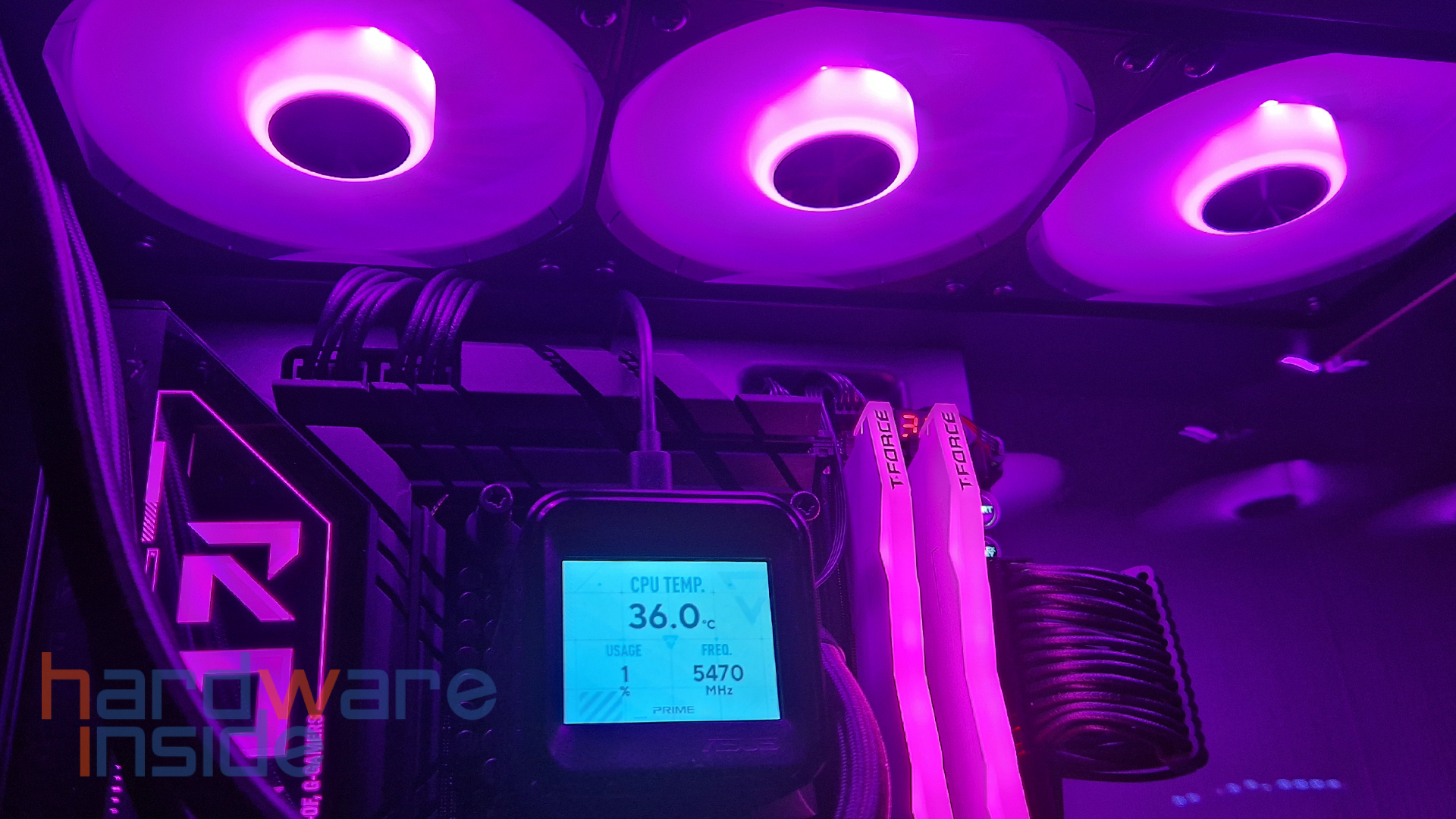 Die ASUS Prime LC 360 ARGB LCD mit ihren drei Prime LC MF-12C ARGB Lüftern und dem LCD-Display machen hier definitiv eine gute Figur und bieten zudem farbenfrohe Lichteffekte, die individuell den eigenen Wünschen über die Mainboard Software angepasst und abgeändert werden können. Hier haben wir gleich drei Farbnuancen für euch eingefangen.