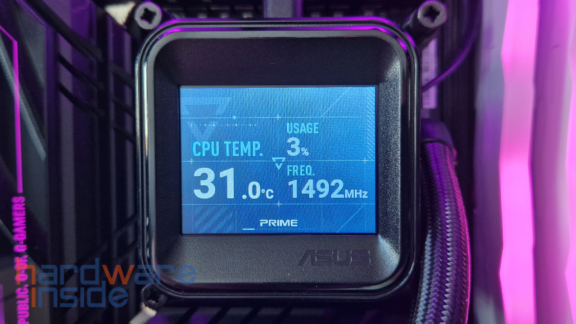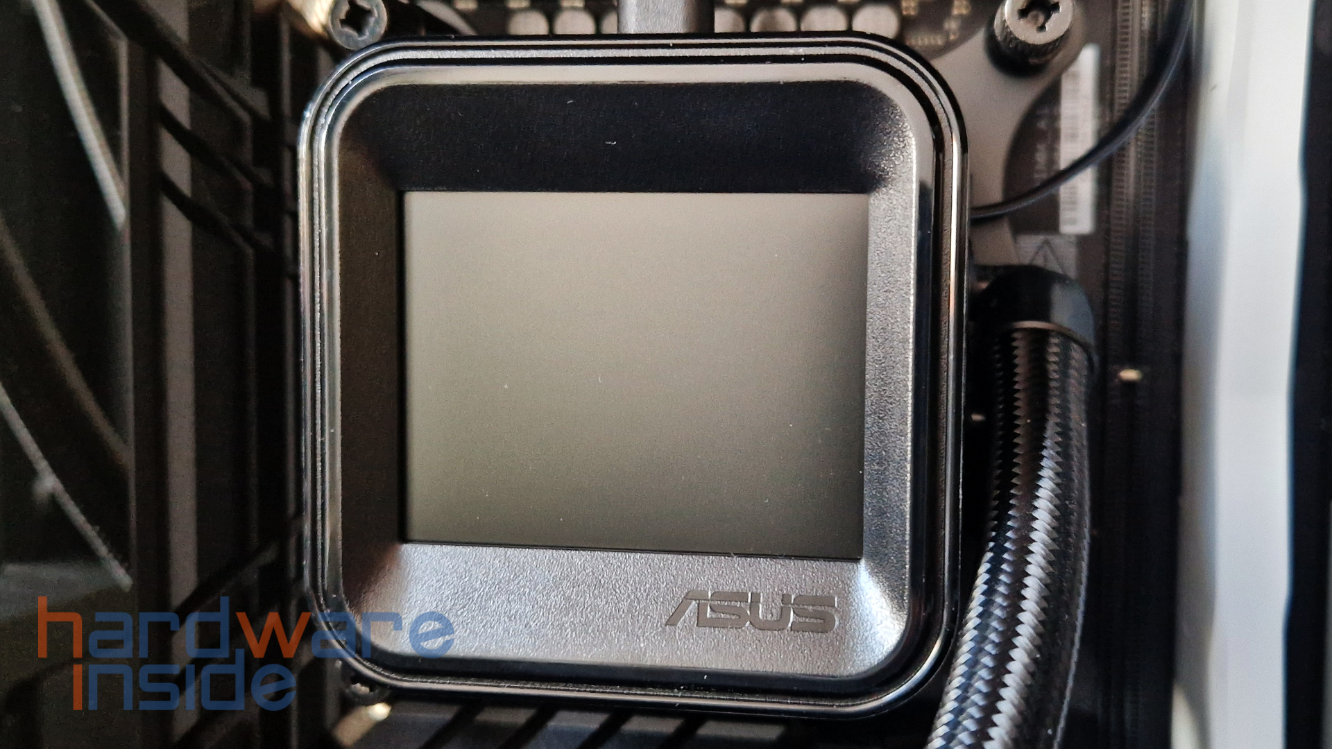 Das Pumpengehäuse selbst, besteht aus schwarzem Kunststoff und ist an der Oberseite mit einem 2,3-Zoll LCD-Display ausgestattet, über welches die Hardwareinformationen für die CPU sowie GPU, die Temperatur, Frequenz und Nutzung (Auslastung) angezeigt wird. Der Schriftzug von ASUS ist dezent unterhalb des Displays integriert.