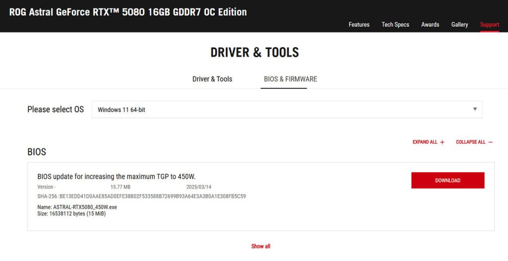Wie VideoCardz nun berichtet, hat ASUS das Kundenfeedback offenbar ernst genommen und entsprechend reagiert. Bereits Mitte März veröffentlichte der Hersteller ein BIOS-Update auf der Support-Seite der ROG Astral GeForce RTX 5080 16 GB GDDR7 OC Edition, das das Power-Limit der Grafikkarte auf bis zu 450 Watt anhebt. Damit wird das Potenzial des Modells deutlich erweitert – insbesondere im Vergleich zur NVIDIA-Referenz von 360 Watt TGP/TDP.