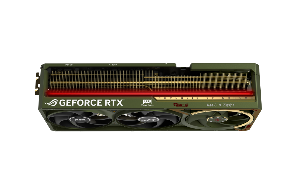 Mit ihrer auffälligen grün-goldenen Farbgebung, dem DOOM Slayer-Motiv auf der Backplate und den markanten grünen Lüftern, die dem Shield Saw nachempfunden sind, ist die ROG Astral GeForce RTX 5080 DOOM Edition eine Hommage an den neuesten Teil der Spielereihe. Für zusätzlichen Flair sind die Anschlussblende und der Kühlkörper ebenfalls in Gold gehalten, um das Thema zu unterstreichen. Dezente Symbole und Sentinel-Figuren rund um den Rahmen der Karte verbinden sie noch stärker mit der Geschichte des Spiels und erhöhen die Attraktivität für Spielende und Sammler, die ein Prunkstück für ihr System oder ihre Vitrine suchen.