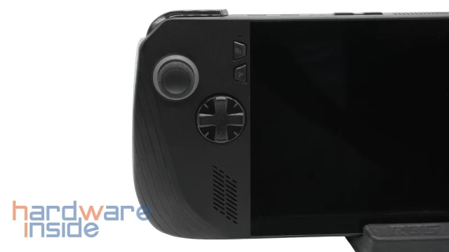 Das ROG Ally X verfügt über Eingabemöglichkeiten, die dem Layout eines XBOX-Controllers nachempfunden sind. Damit kann nicht nur die Steuerung in Spielen übernommen werden, auch das Windows-Betriebssystem lässt sich dank emulierter Maussteuerung mit Stick und Schultertasten bedienen. Links neben dem Display befinden sich ein analoger Joystick, ein 8-Wege-Steuerkreuz sowie zwei Funktionstasten. Die obere Funktionstaste entspricht der „View-Taste“ eines Xbox-Controllers und wird in Spielen häufig als sekundäre Menu-Taste genutzt. Die untere Funktionstaste öffnet das Command Center, ein Overlay, mit dem viele Einstellungen mit einem Klick vorgenommen werden können.