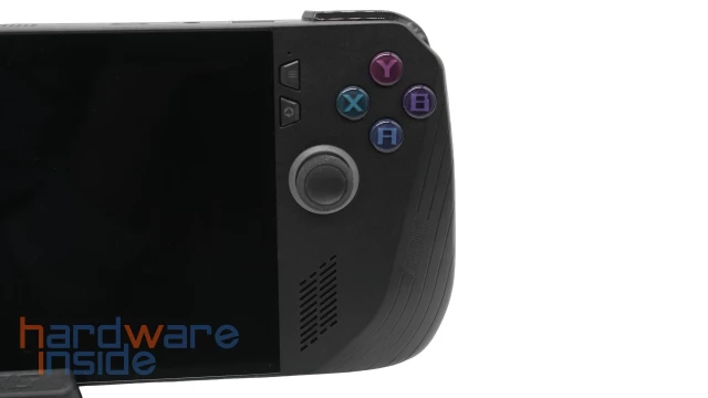 Auf der rechten Seite des Handhelds befinden sich vier Aktionstasten, die A-, B-, X- und Y-Tasten eines Xbox-Controller-Layouts, darunter ein Joystick. Auch auf dieser Seite befinden sich direkt neben dem Display zwei Funktionstasten, die obere ist die Menütaste, die Taste darunter öffnet die Anwendung Armory Crate. Außerdem besitzt der Handheld auf jeder Seite zwei Schultertasten, genauer gesagt eine Taste und einen analogen Trigger. Auf der Rückseite befinden sich schließlich die Tasten M1 und M2, die mit einer einstellbaren Aktion belegt werden können. Auch eine Zweitbelegung der Tasten ist über diese Tasten möglich, wenn sie entsprechend konfiguriert sind.