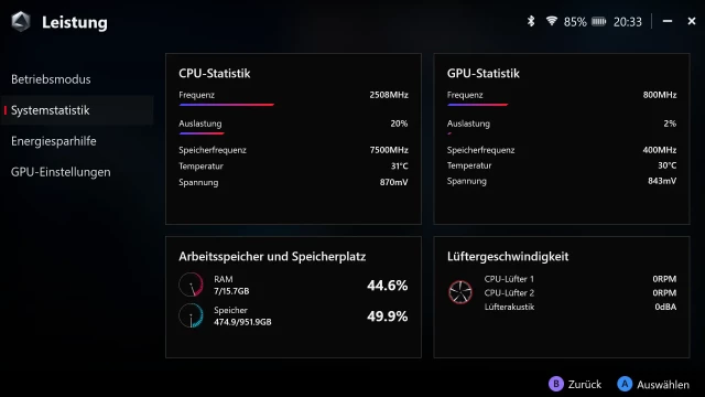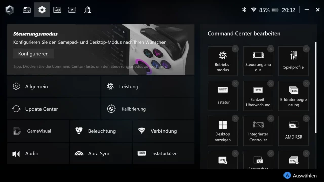 Das Command Center kann jederzeit über die Funktionstaste links neben dem Display geöffnet werden. Es handelt sich dabei um ein Menü, über das einfach und schnell einige Einstellungen vorgenommen werden können. Beispielsweise können das aktive Leistungsprofil, der Steuerungsmodus, eine Bildratenbegrenzung oder die Auflösung schnell geändert werden. Außerdem kann ein Echtzeit-Monitoring eingeschaltet werden, das über die Auslastung von CPU und GPU sowie die aktuelle Bildrate und den Stromverbrauch informiert. Die verfügbaren Schaltflächen können in der Armoury Crate Anwendung individuell angepasst werden und bieten weitere mögliche Schnellfunktionen. Stets verfügbar sind die Einstellungen für die Bildschirmhelligkeit, die Lautstärke und eine Schaltfläche zum Ausschalten des Geräts.