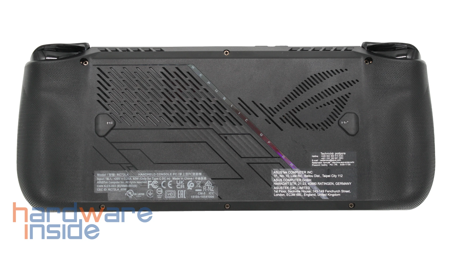 Auf der Rückseite des Handhelds befinden sich sechs Schrauben, die die beiden Schalen des Außengehäuses zusammenhalten. Wir lösen die Schrauben und öffnen den Handheld vorsichtig. Schon beim Öffnen des Handhelds fällt ein Unterschied zum Vorgänger auf, während die hintere Hülle noch ohne elektronische Bauteile auskam, befinden sich hier beim Ally X zwei Platinen zur Ansteuerung der Knöpfe M1 und M2. Beim Auseinandernehmen muss man daher vorsichtiger sein, um die empfindlichen Flachbandkabel nicht zu beschädigen.