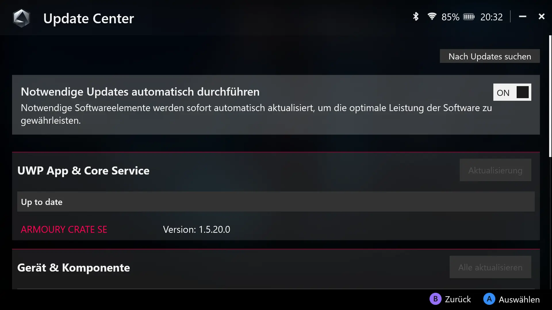 Die Armoury Crate Anwendung ist für viele Asus-Produkte eine zentrale Konfigurationssoftware. Wie schon auf dem ROG Ally Z1E, ist auch das ROG Ally X mit einer für den Handheld überarbeitete Variante ausgestattet. Seit dem Release des ersten ROG Ally fand ein kleines Re-Design der Anwendung statt, weshalb wir euch hier die aktuelle Fassung vorstellen können: