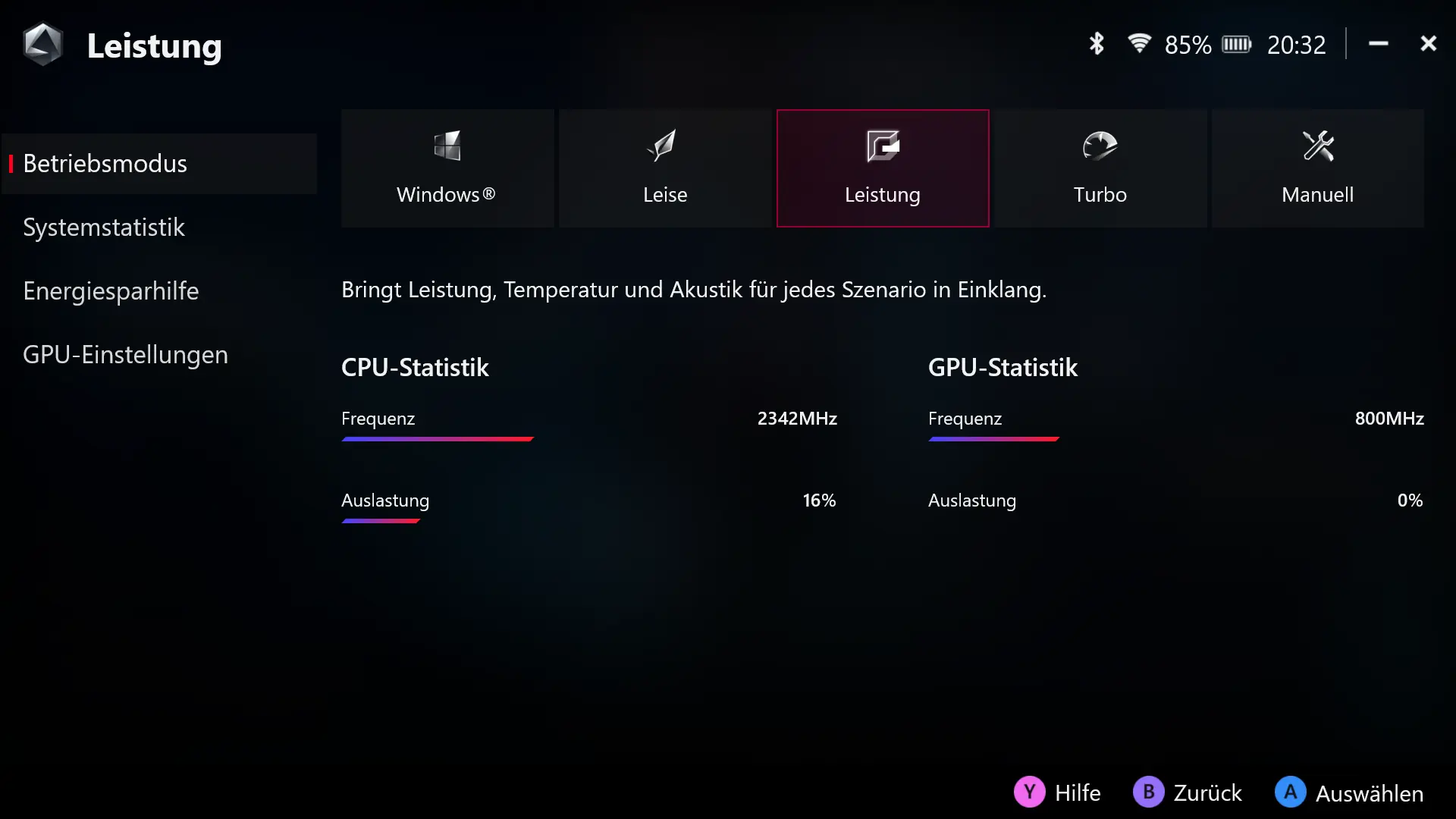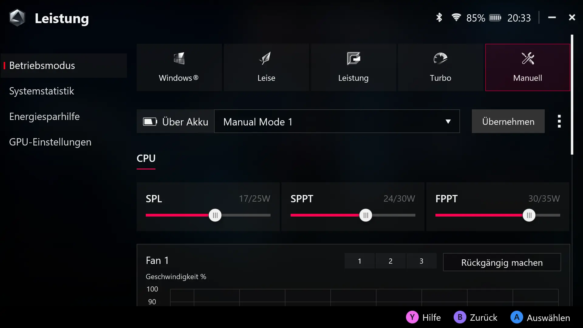 Die Armoury Crate App bietet nicht nur zahlreiche Einstellungsmöglichkeiten für ROG Ally, sondern auch einen zentralen Launcher für installierte Spiele und Spieleplattformen. So kann beispielsweise Steam direkt aus der Anwendung heraus installiert werden, über Steam installierte Spiele erscheinen automatisch in der Armoury Crate Anwendung. In der Konfigurationsansicht finden sich viele Einstellungen, neben der Konfiguration der Steuerungsmodi und der Buttonbelegung können beispielsweise auch die Analogsticks und Trigger kalibriert werden. Auch die im Command Center verfügbaren Buttons können hier konfiguriert werden. In der Kategorie Performance finden sich nicht nur zahlreiche Informationen zu aktuellen Taktraten, Auslastungen und Temperaturen des Prozessors, sondern es können auch eigene Performance-Profile erstellt werden, für die Leistungsgrenzen und Lüfterverhalten definiert werden können. Im Update Center können Treiber- und Firmware-Updates installiert werden. Die hier verfügbaren Versionen sind jedoch nicht immer aktuell. Bei Problemen mit einem aktuellen Treiber lohnt es sich auch, in der MyAsus-App oder auf der Website des Herstellers nach neueren Treibern zu suchen.