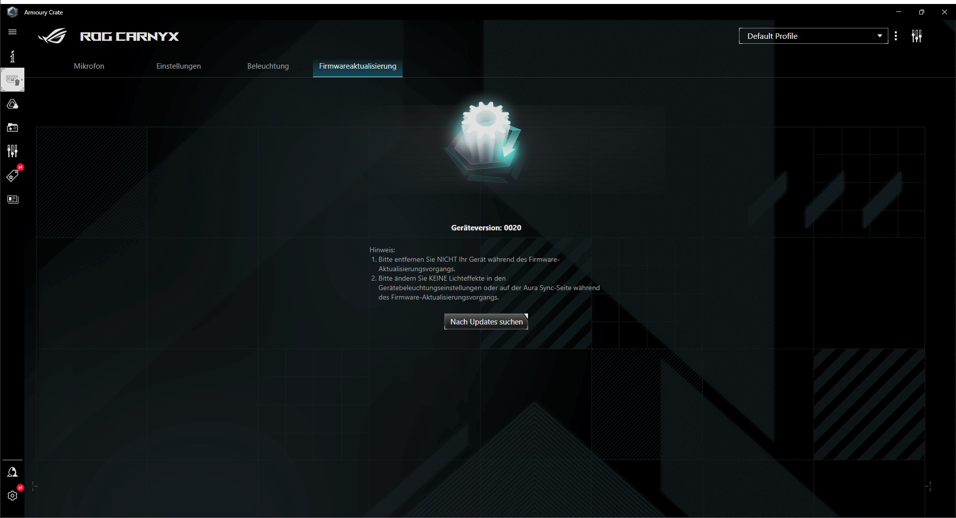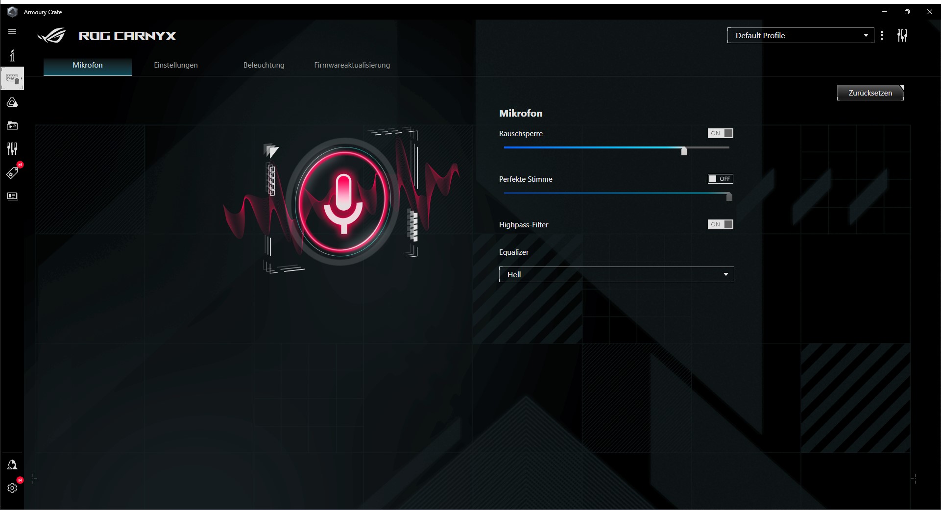 ASUS setzt bei allen Peripheriegeräten auf die Software „Armoury Crate“. Diese bietet wie gewohnt zahlreiche Einstellungsmöglichkeiten. Sobald das ASUS ROG Carnyx Mikrofon mit dem PC verbunden ist, können wir verschiedene Einstellungen vornehmen, um unsere Aufnahme zu verbessern.