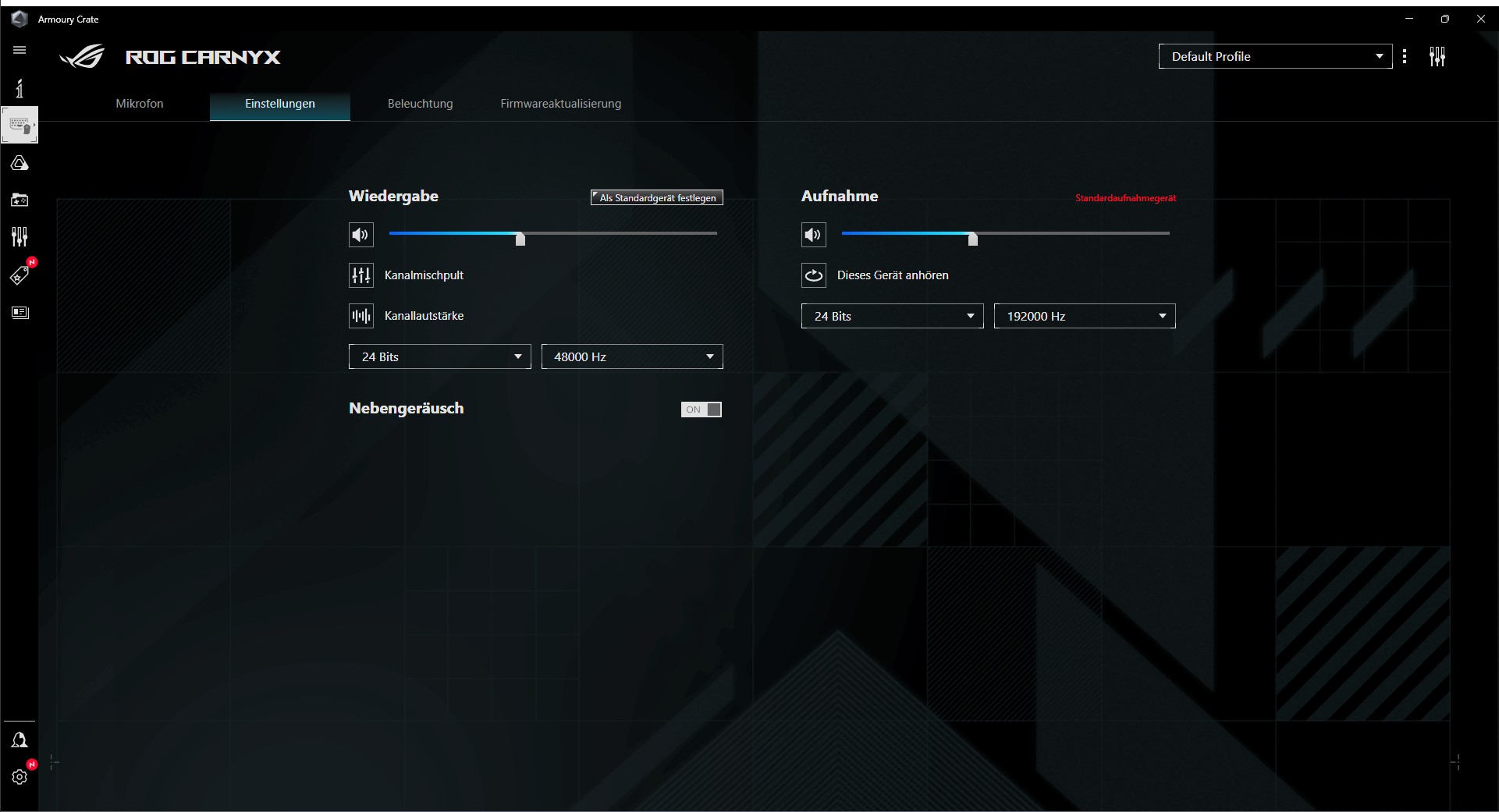 Das Rog Carnyx kann per Plug&Play direkt an den PC angeschlossen werden. Die Installation einer zusätzlichen Software ist nicht erforderlich, wird aber für spezielle Einstellungen wie Rauschunterdrückung oder Beleuchtung benötigt. Unter Windows kann in den Eigenschaften überprüft werden, ob das Gerät als Standardgerät ausgewählt ist und ob das Format auf der höchsten Stufe steht.