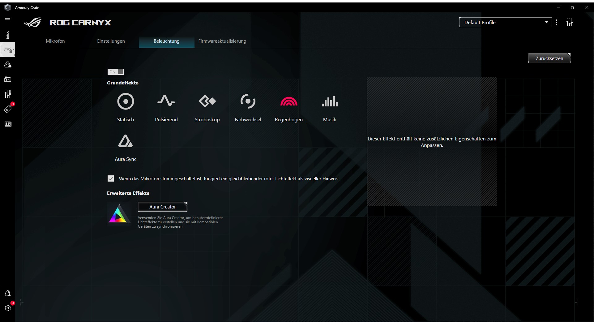 Im Reiter „Beleuchtung“ lässt sich, wie der Name schon vermuten lässt, einstellen, wie das Mikrofon beleuchtet wird. Wir können diese hier auch ausschalten. Neben den Standardeffekten haben wir auch die Möglichkeit, mit dem Aura Creator eigene Effekte zu erstellen. Mit einem kleinen Haken können wir auch einstellen, dass wir visuell informiert werden, sobald wir das Mikrofon über die Stummschalttaste stummschalten.