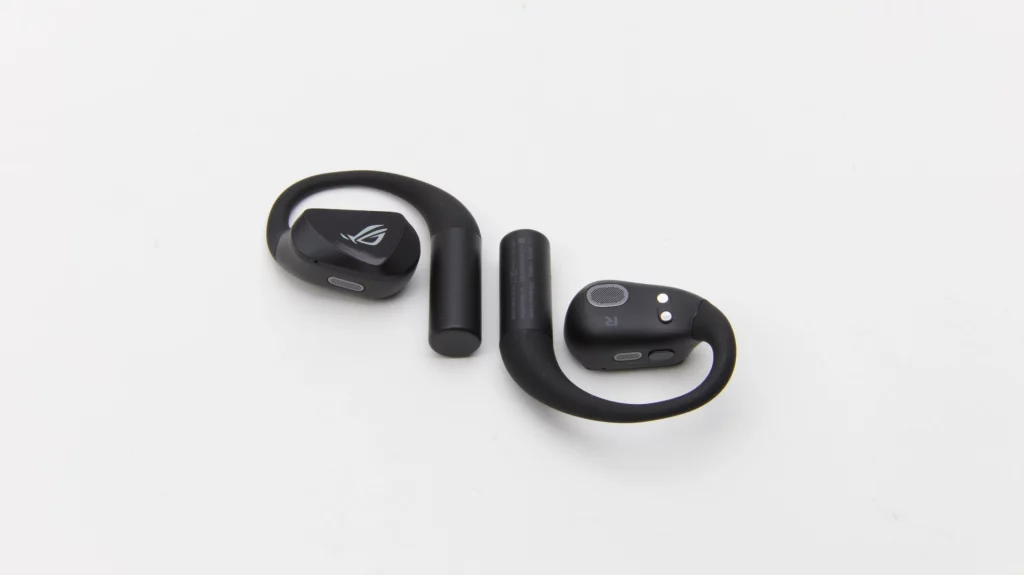 Die Earbuds selbst wiegen jeweils 11 g und messen 31 x 18 x 21 mm. Sie setzen auf ein Open-Ear-Design mit Ohrbügeln aus Silikon, die laut ASUS hautfreundlich sein sollen und den Druck auf das Ohr minimieren. Der Treiber sitzt in einem Gehäuseteil, das vor dem Gehörgang positioniert wird, ohne in diesen einzudringen. Die Schallübertragung erfolgt per Luftleitung (Air Conduction), nicht über Knochenleitung.