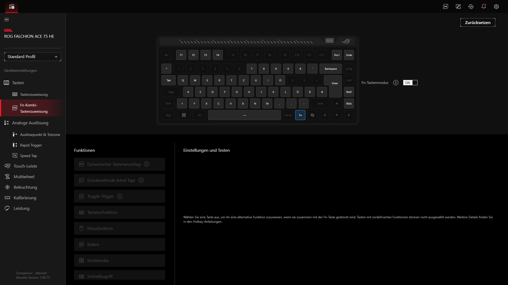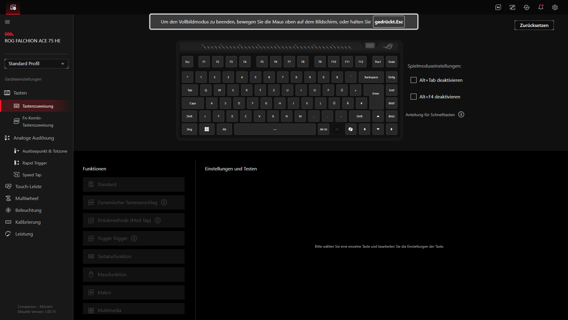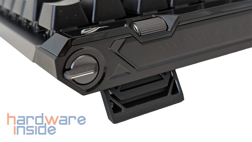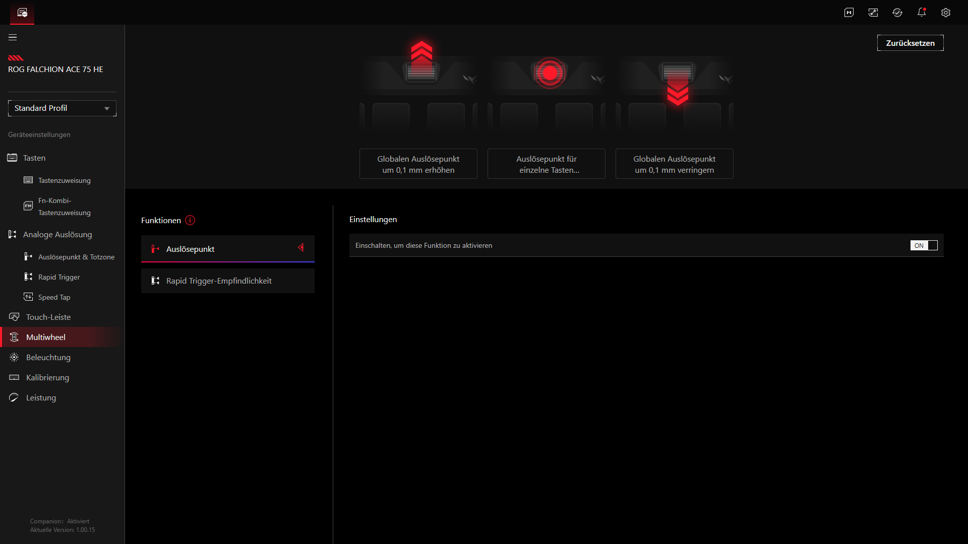 Besonders gelungen wirkt auf dem Papier das Sensitivity Adjustment Wheel. Im Gegensatz zu vielen anderen Tastaturen dient es nicht primär als klassisches Lautstärkerad, sondern greift direkt auf die Hall-Effekt-Funktionen zu. Durch Drücken wird zwischen Auslösepunkt und Rapid-Trigger-Empfindlichkeit gewechselt, durch Drehen erfolgt anschließend die Feinanpassung. Wenn man das Rad länger gedrückt hält, gelangt man sogar in einen Modus zur Per-Key-Anpassung. Genau dieses Rad ist einer der Punkte, mit denen sich die Falchion Ace 75 HE von vielen anderen Kompaktmodellen absetzt, da ASUS hier einen echten Mehrwert für die direkte Bedienung schafft. Einstellungen lassen sich damit schnell anpassen, ohne dass die Software geöffnet werden muss. Schade ist jedoch, dass sich keine Custom-Funktionen auf das Rad einbinden lassen.