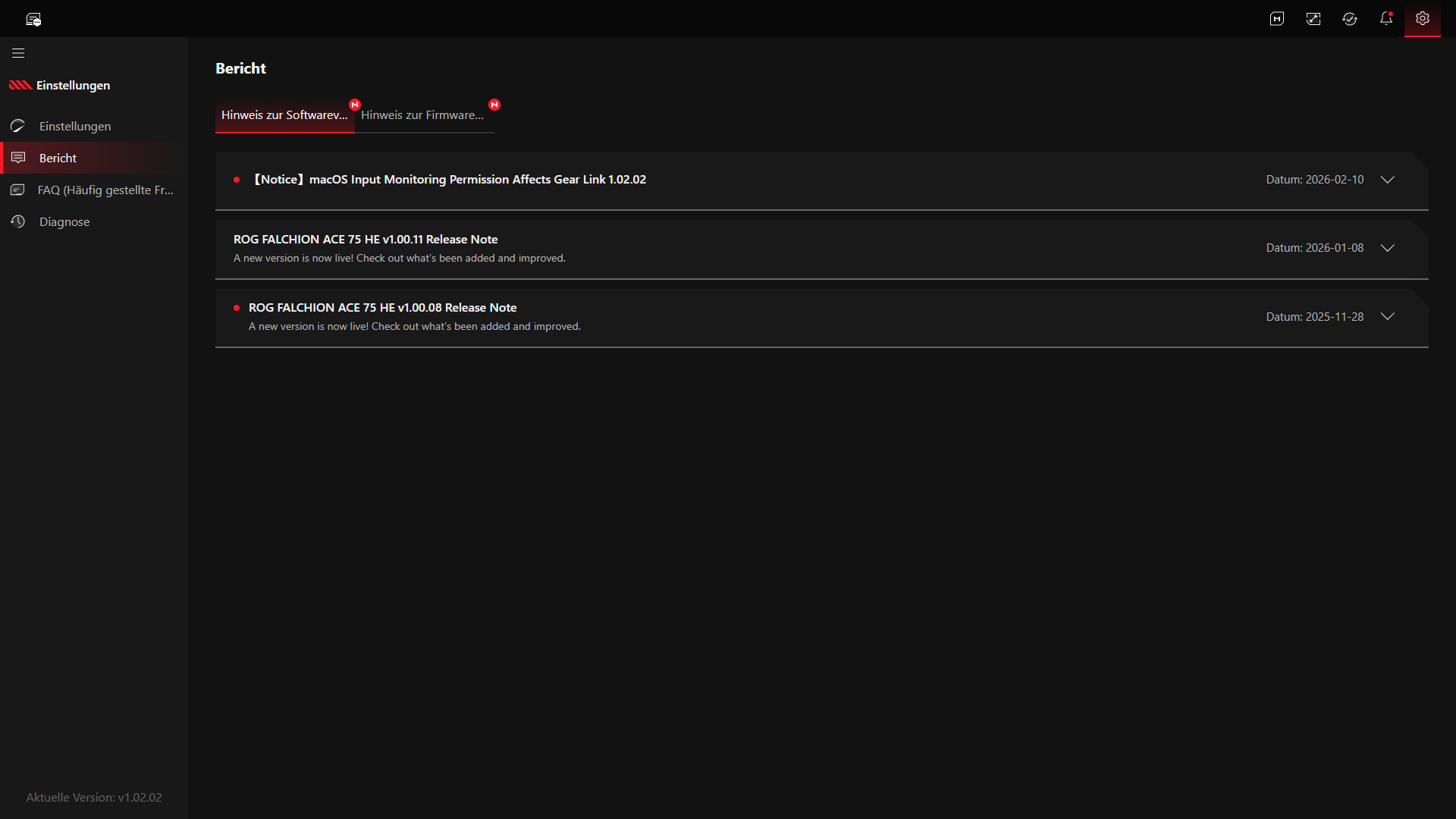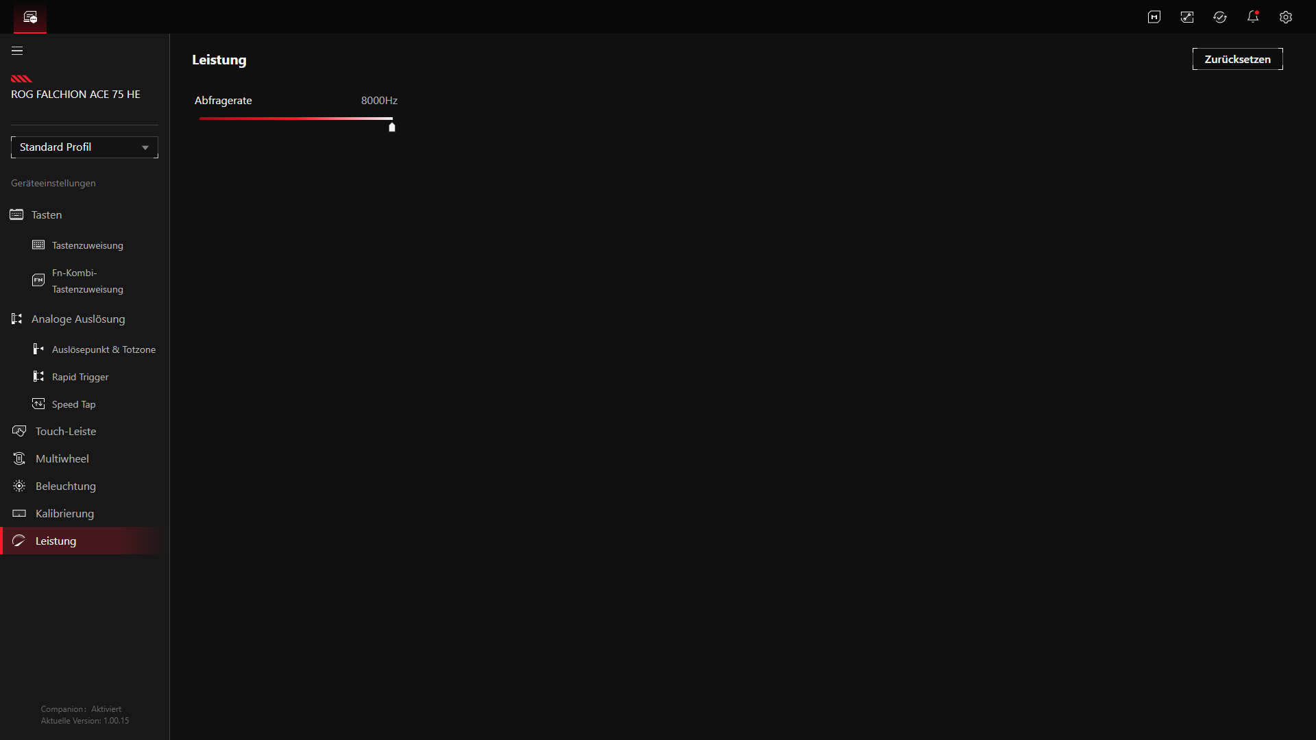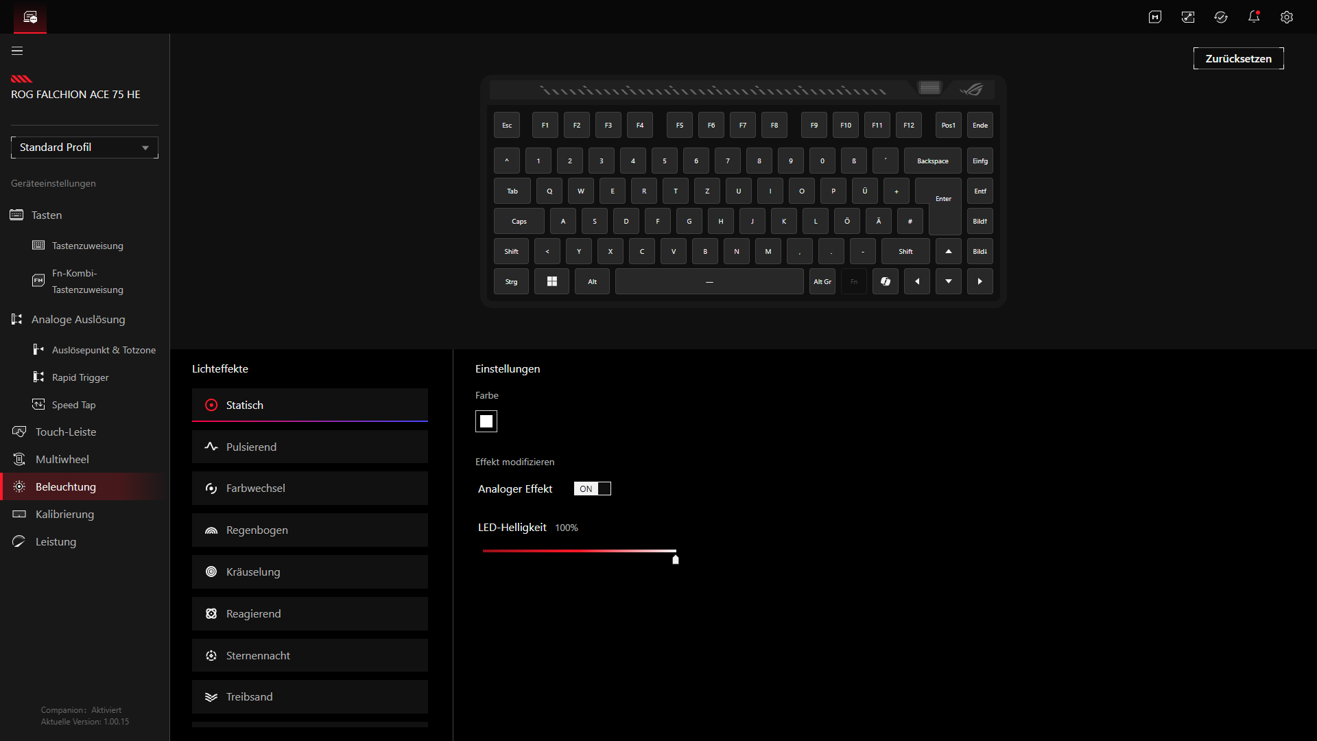 Praktisch ist außerdem, dass sich bestimmte Dinge nicht zwingend nur über Gear Link erledigen lassen. ASUS kombiniert die Browser-Lösung mit mehreren Direktfunktionen an der Tastatur selbst, etwa für Rapid Trigger oder die Anpassung von Auslösepunkt und Empfindlichkeit. Dadurch wirkt Gear Link in der Praxis weniger wie eine Pflichtsoftware und eher wie eine sinnvolle Ergänzung für die Feinarbeit. Wer tiefer in die Einstellungen eingreifen möchte, erhält die entsprechenden Optionen, während grundlegende Anpassungen auch ohne ständiges Wechseln in Menüs möglich bleiben. Solche erweiterten Optionen sind etwa bestimmte RGB-Effekte oder die Firmware-Aktualisierung. Genau diese Mischung aus einfacher Erreichbarkeit und umfangreicher Konfiguration passt gut zur Ausrichtung der ROG Falchion Ace 75 HE.