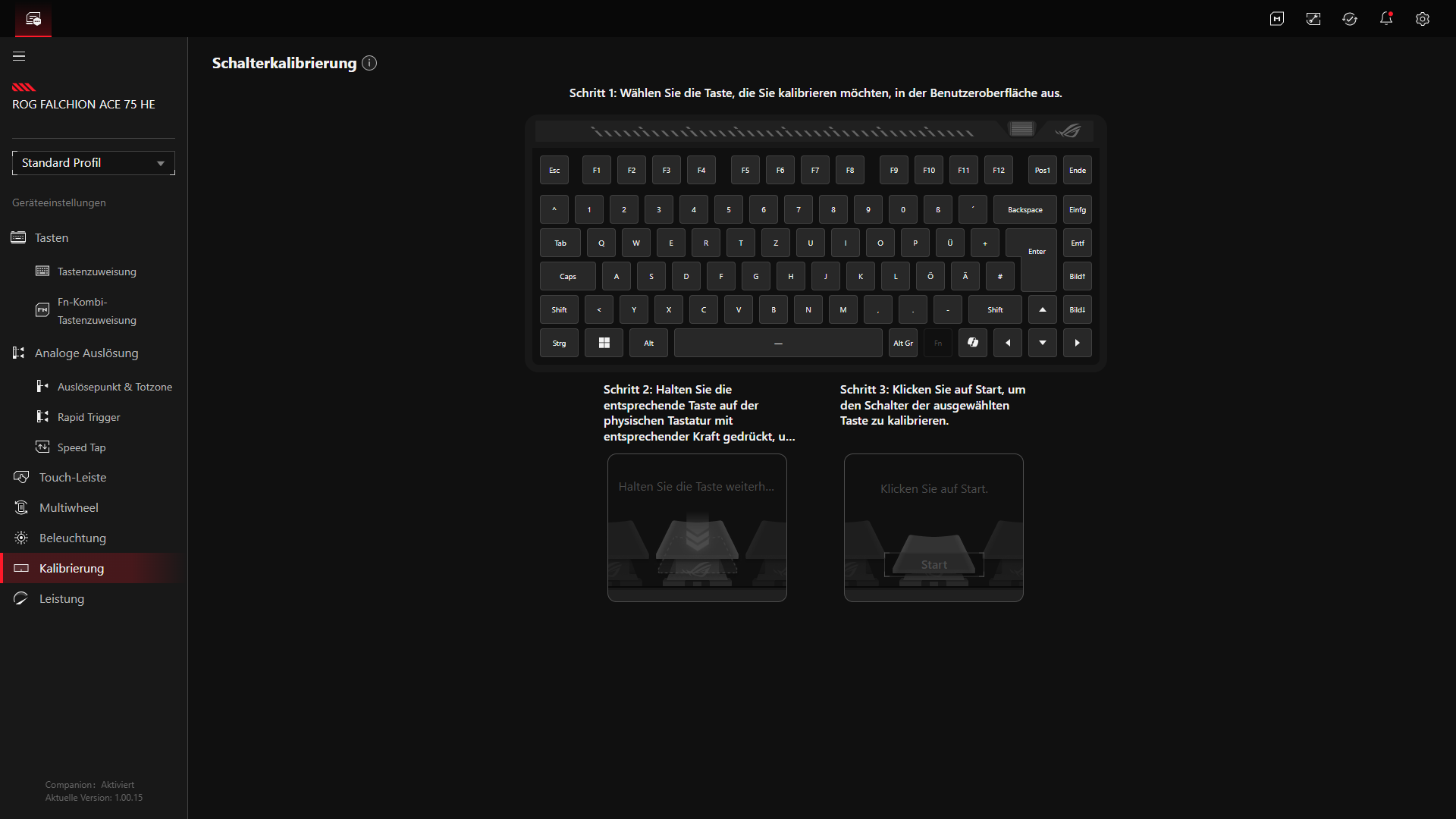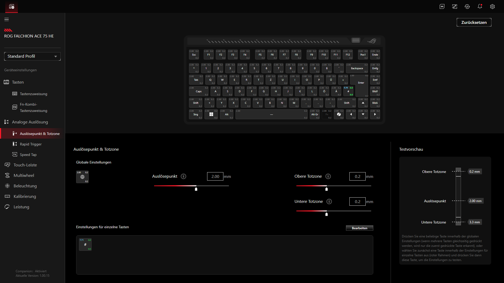 In der Praxis passt das gut zum Charakter der Tastatur. Über Gear Link lassen sich unter anderem Tastenfunktionen, Beleuchtung, Rapid Trigger, globale oder einzelne Auslösepunkte, Dead-Zone-Einstellungen sowie die Kalibrierung einstellen. Gerade bei den Hall-Effekt-Switches ist das sinnvoll, da sich die Tastatur dadurch nicht nur oberflächlich konfigurieren lässt, sondern sehr gezielt auf den eigenen Einsatzzweck abstimmen lässt. Positiv ist dabei auch, dass ASUS die Tastatur trotz der Web-Lösung nicht zu stark einschränkt, sondern einen ordentlichen Funktionsumfang bietet.