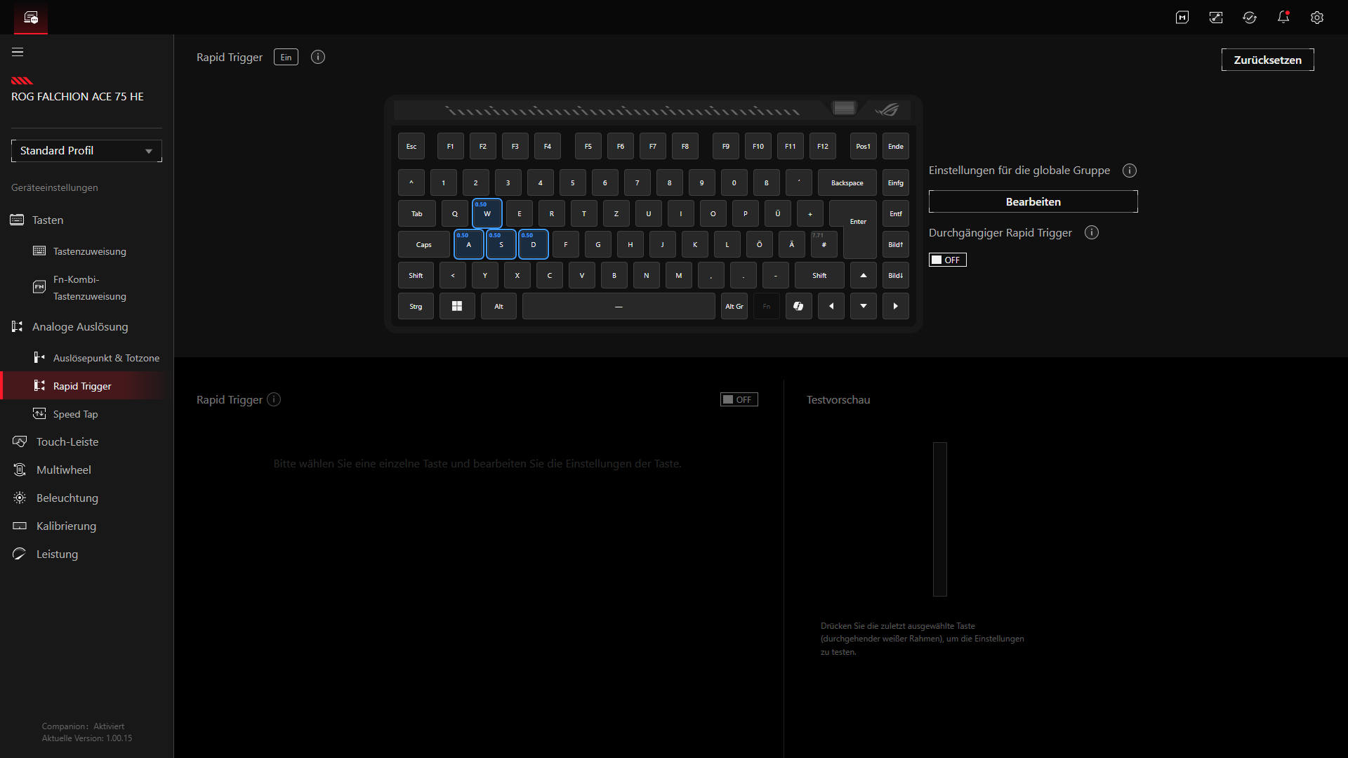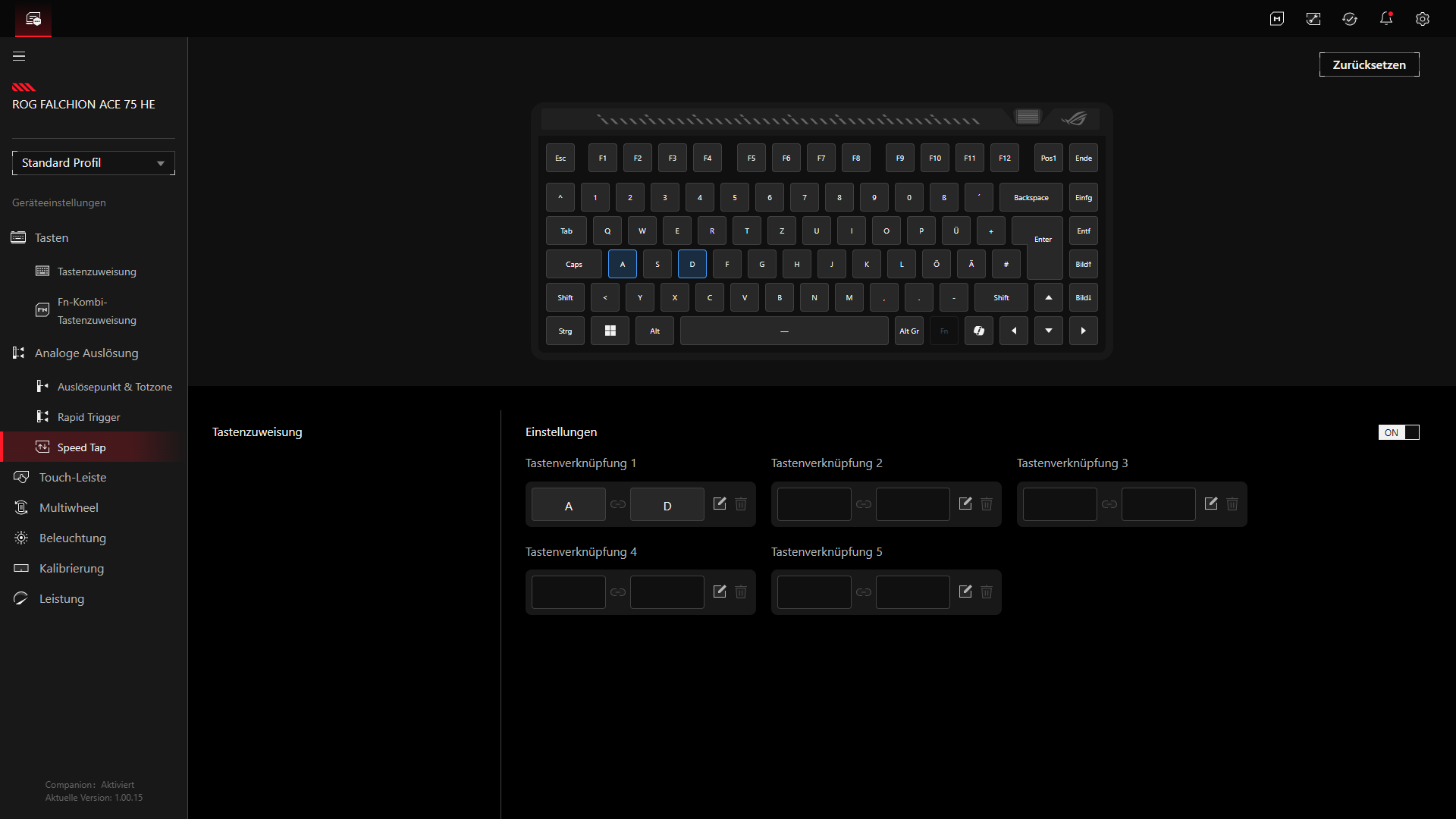 Zu den wichtigsten Gaming-Funktionen zählt der Rapid Trigger. ASUS spendiert der Falchion Ace 75 HE dafür einen eigenen Schalter an der Rückseite, über den sich die Funktion direkt aktivieren lässt. Standardmäßig ist Rapid Trigger zunächst nur für WASD aktiv. Weitere Anpassungen erfolgen über Gear Link. Ergänzt wird das Ganze durch „Speed Tap“, das gegenläufige Eingaben priorisiert und standardmäßig auf die Tasten „A“ und „D“ ausgelegt ist. Der Modus wird per Fn + Caps aktiviert, die Tasten quittieren den Status dabei mit einer kurzen farbigen Rückmeldung. Gerade für schnelle Richtungswechsel in Shootern ist das ein klar auf kompetitives Gaming zugeschnittenes Feature.
