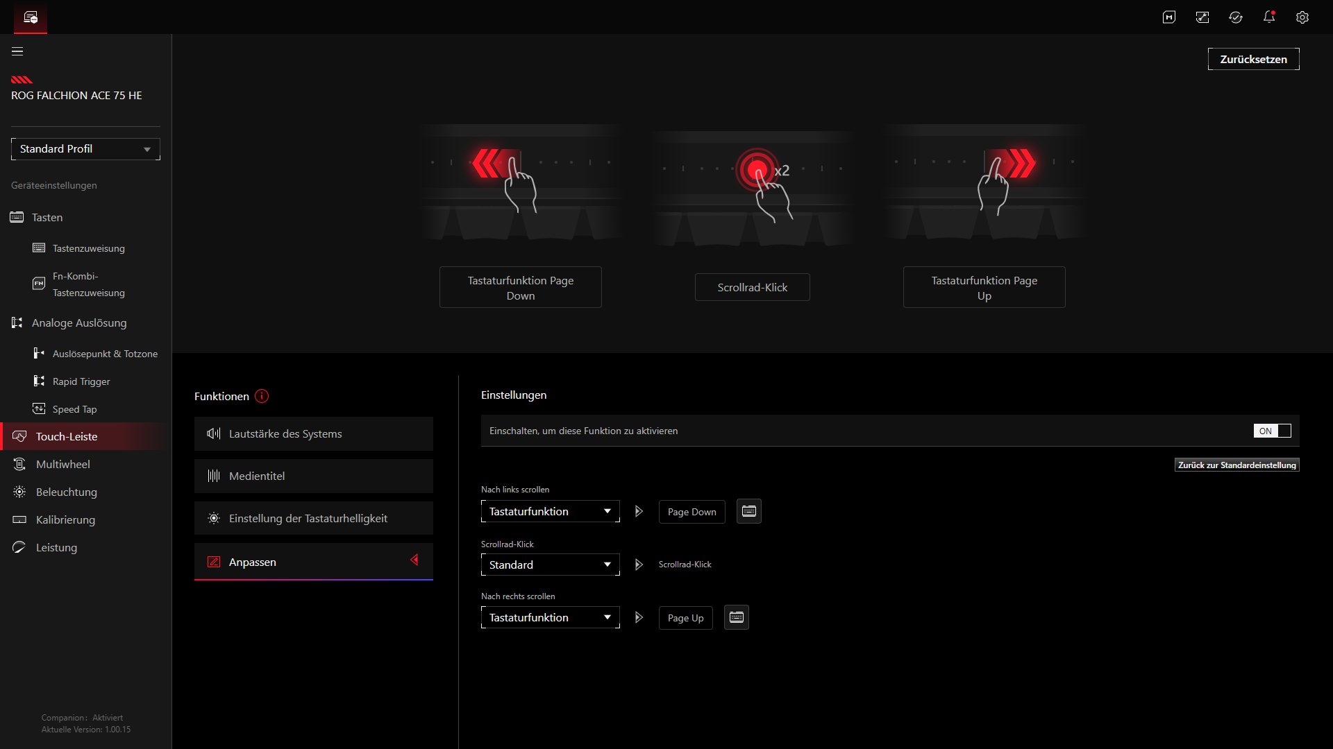 | Multifunktionstasten | Multi-Function Button (Lautstärke, Mediensteuerung, Beleuchtungshelligkeit und Maus-Scrollen) Touch Panel (dient der Multi-Funktionalität) Sensitivity Adjustment Wheel (Anpassung von Auslösepunkt und Rapid Trigger) |