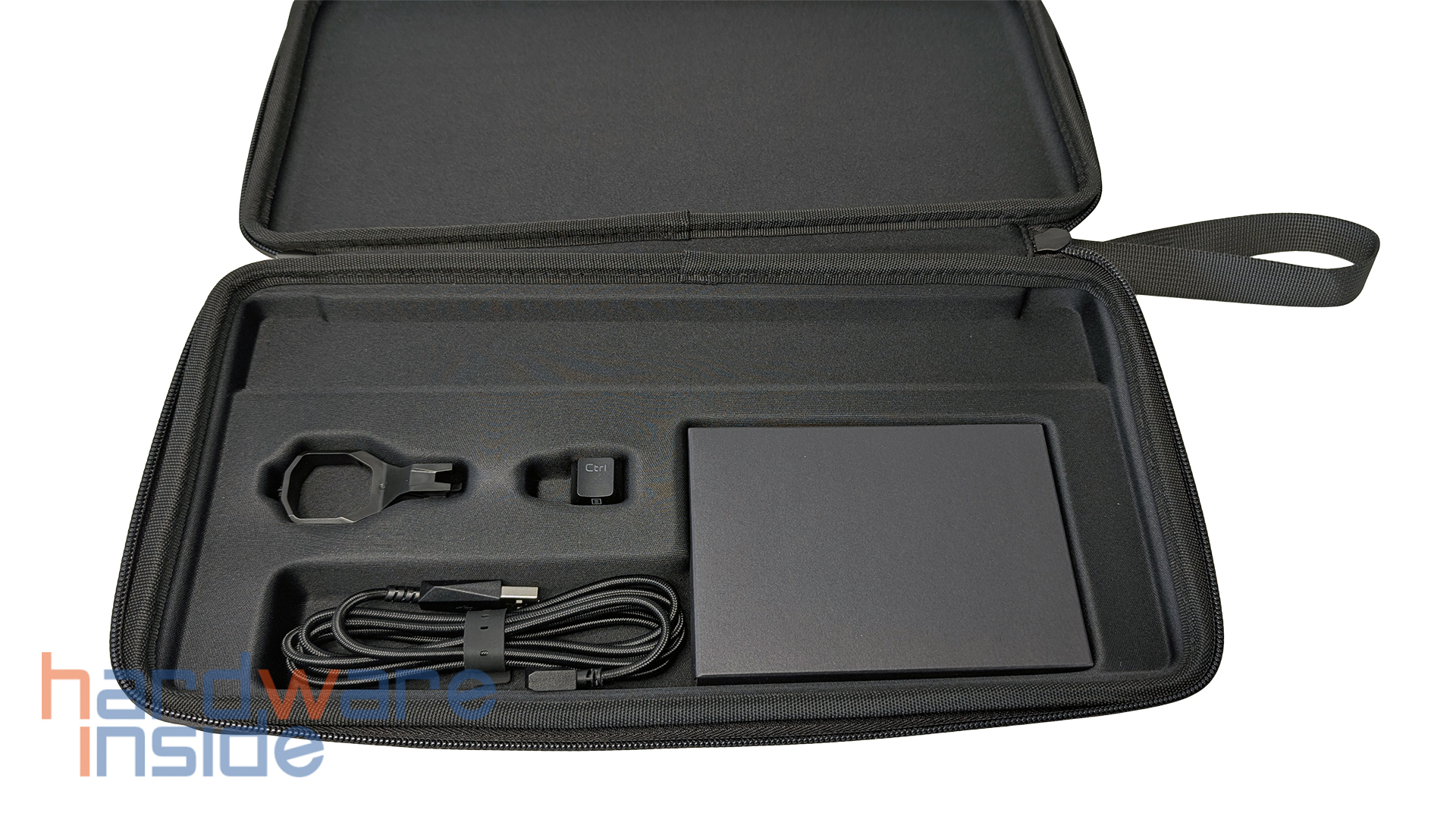Der Lieferumfang der ASUS ROG Falchion Ace 75 HE ist insgesamt sinnvoll und praxisnah. ASUS legt der Tastatur alles bei, was für den direkten Start benötigt wird, ohne den Karton mit unnötigen Extras zu überladen. Neben der Tastatur selbst gehören das bereits erwähnte Protective Keyboard Carry Case, ein USB-C-auf-USB-A-Kabel, ein ROG Keycap Puller, eine zusätzliche Ctrl-Keycap, das Warranty Booklet, ein Quick-Start-Guide sowie ein ROG-Sticker zum Inhalt.