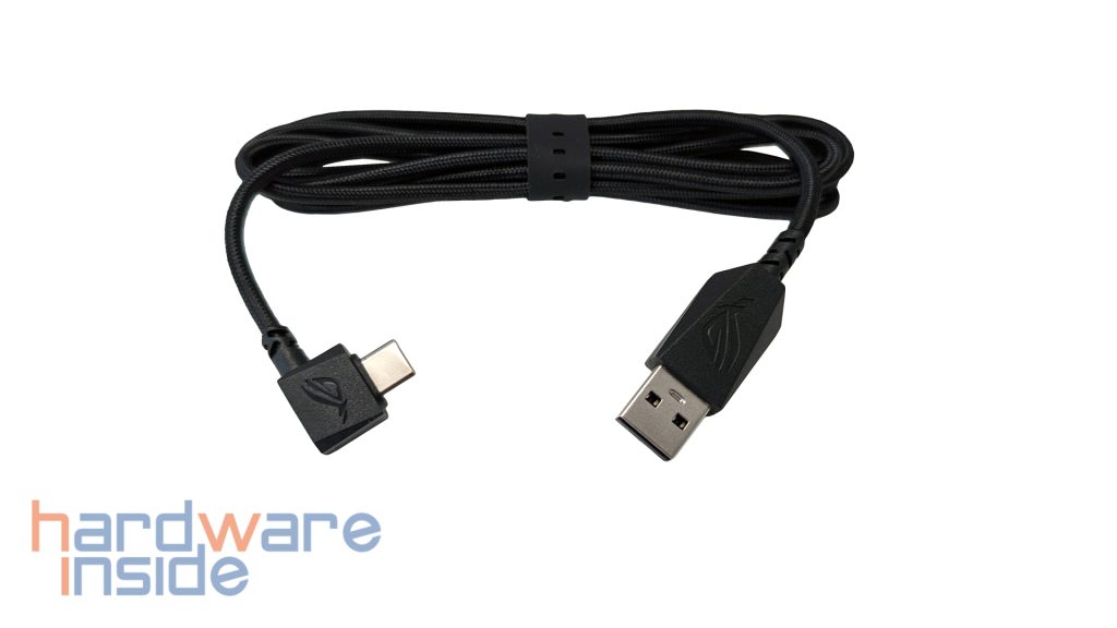 Zum Lieferumfang gehört ein abnehmbares, geflochtenes USB-A-auf-USB-C-Kabel. Es wirkt nicht nur hochwertiger als einfache standardmäßige Kabel, sondern passt auch gut zum gehobenen Anspruch der Tastatur. ASUS hebt zudem den angewinkelten USB-C-Stecker hervor. Dieser soll für ein saubereres Setup sorgen und das Kabel etwas besser aus dem Bereich der Mausbewegungen halten. Gerade bei einer kompakten 75%-Tastatur ist das ein kleines, aber durchaus sinnvolles Detail, da solche Modelle häufig in eher engen oder aufgeräumten Setups genutzt werden.