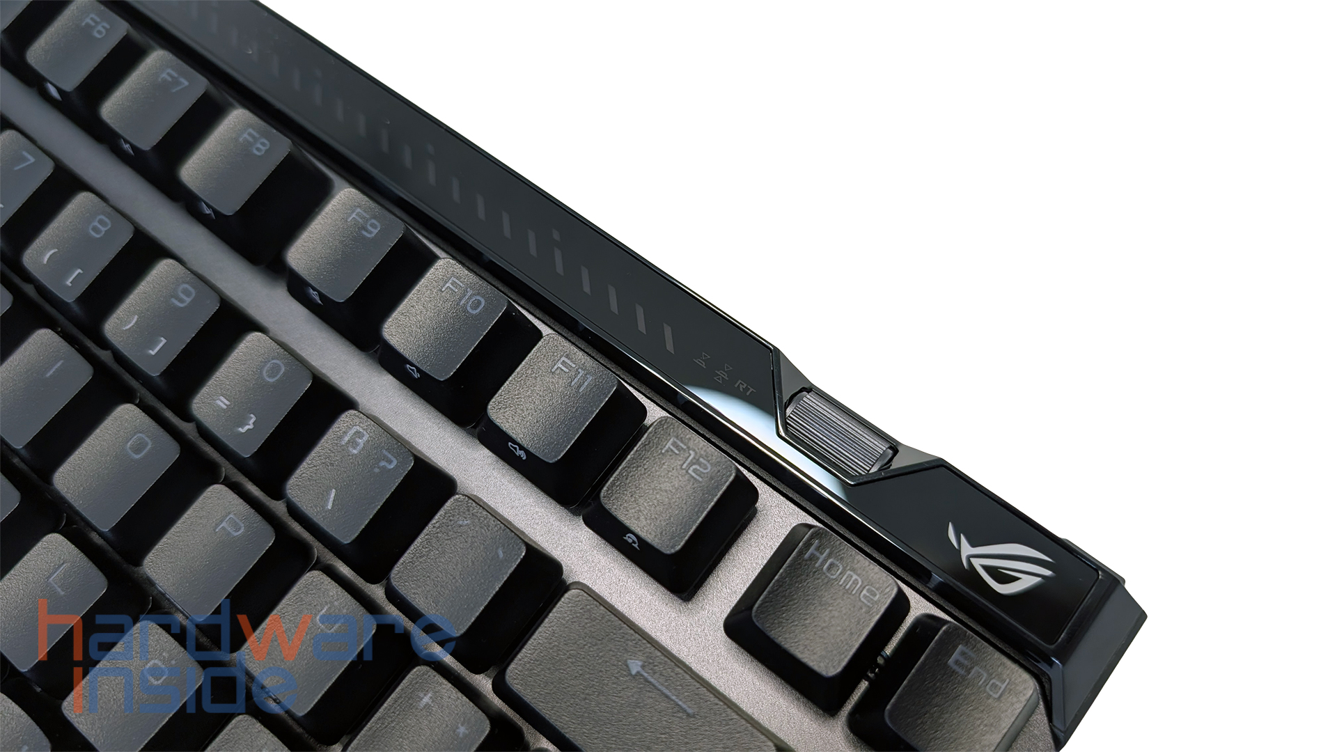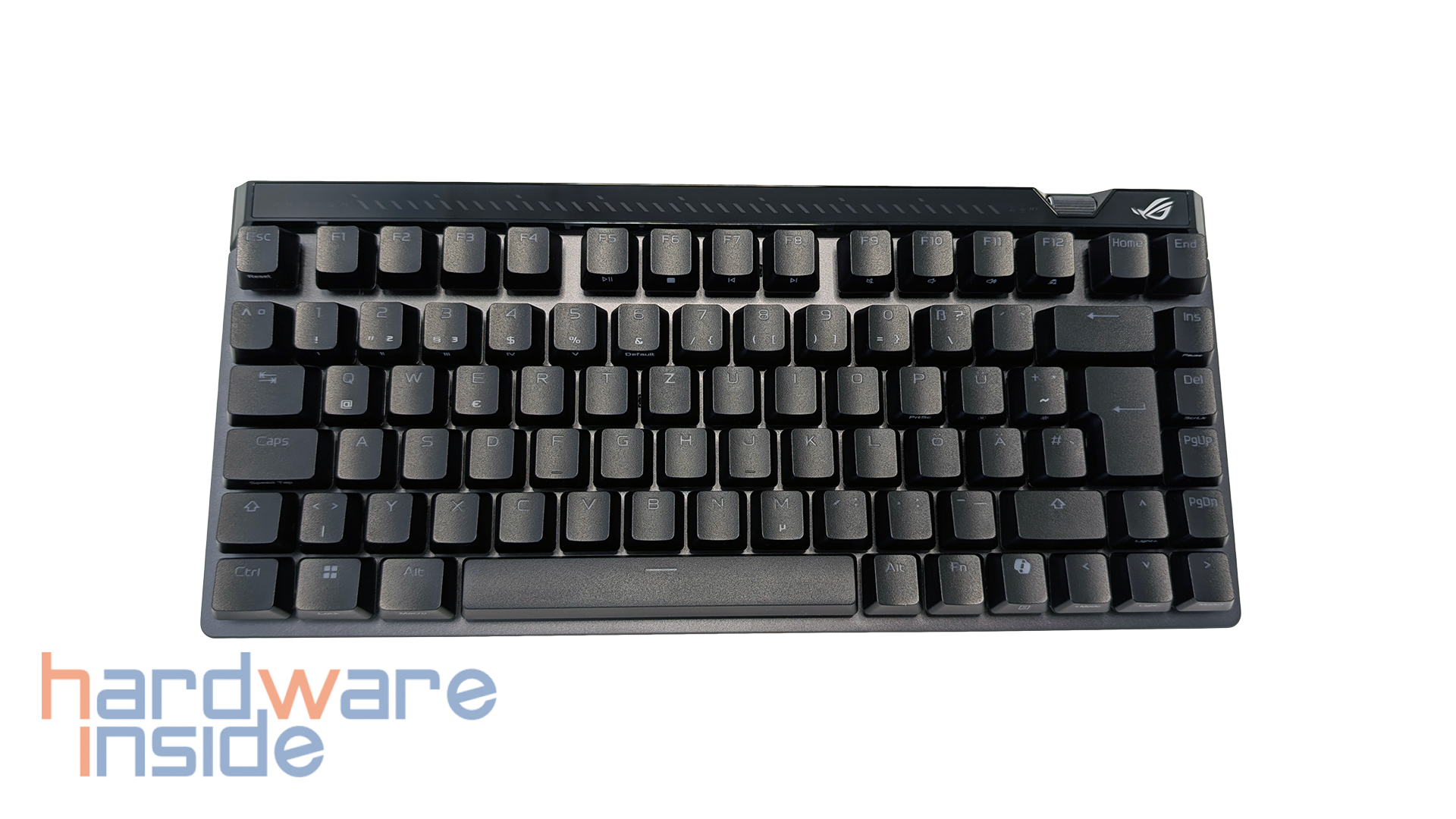 Ein wesentlicher Bestandteil des Konzepts der ASUS ROG Falchion Ace 75 HE sind die zahlreichen direkten Bedienelemente an der Tastatur selbst. ASUS versucht erkennbar, wichtige Funktionen nicht nur über Software, sondern auch direkt an der Hardware zugänglich zu machen. Dazu gehören neben dem Multifunktionsbutton und dem Touch-Panel auch der Rapid-Trigger-Toggle, die RGB-Lichtleiste an der Oberkante sowie das Sensitivity Adjustment Wheel. Gerade bei einer Hall-Effekt-Tastatur ist dieser Ansatz sinnvoll, da sich so viele entscheidende Einstellungen ohne Umwege direkt am Gerät anpassen lassen.