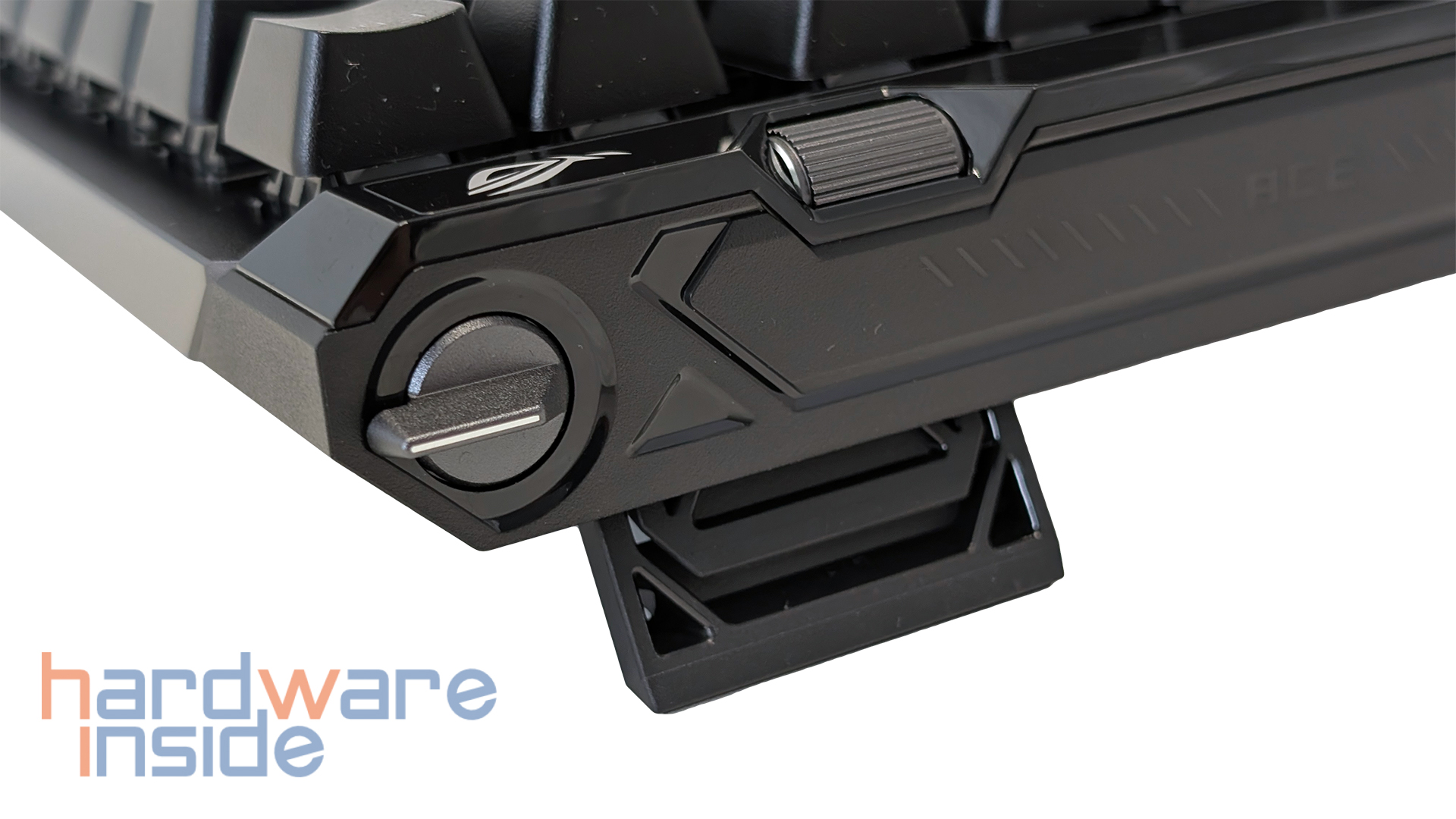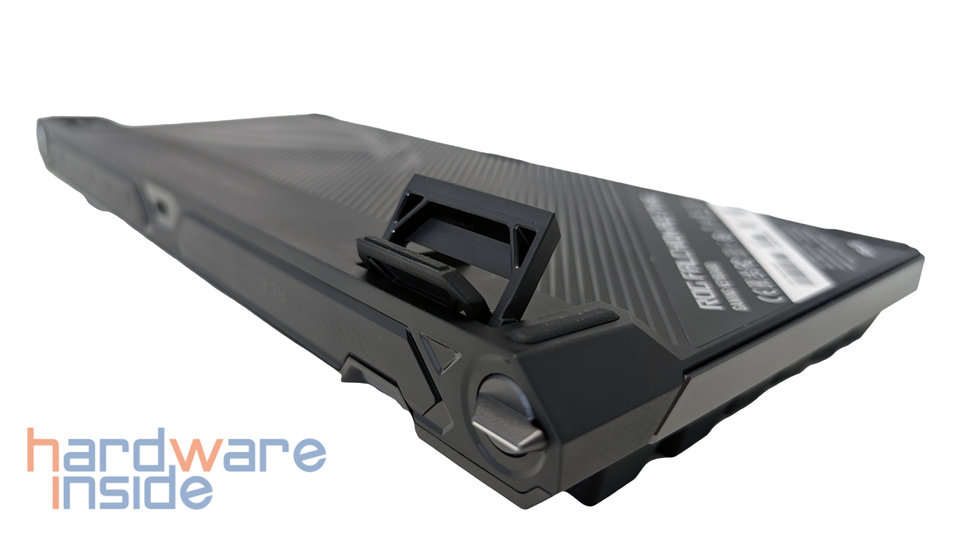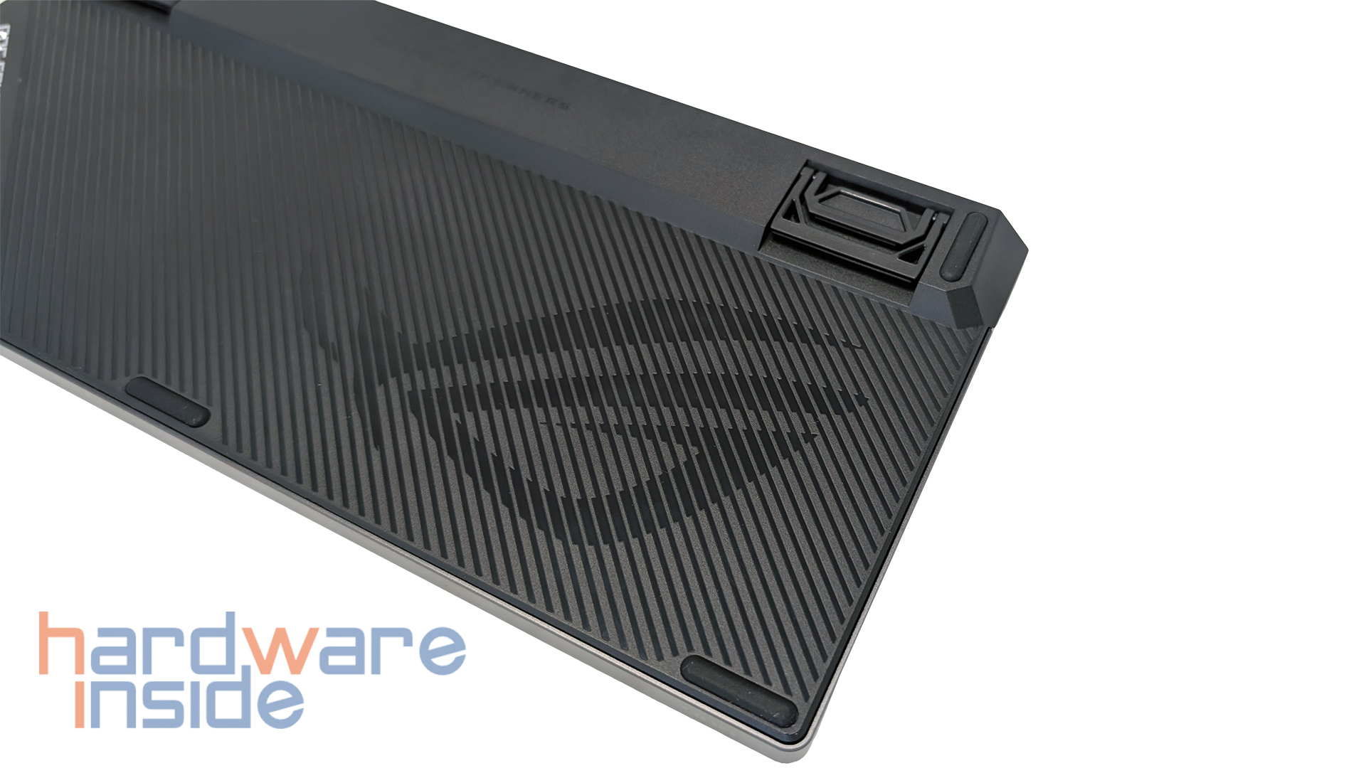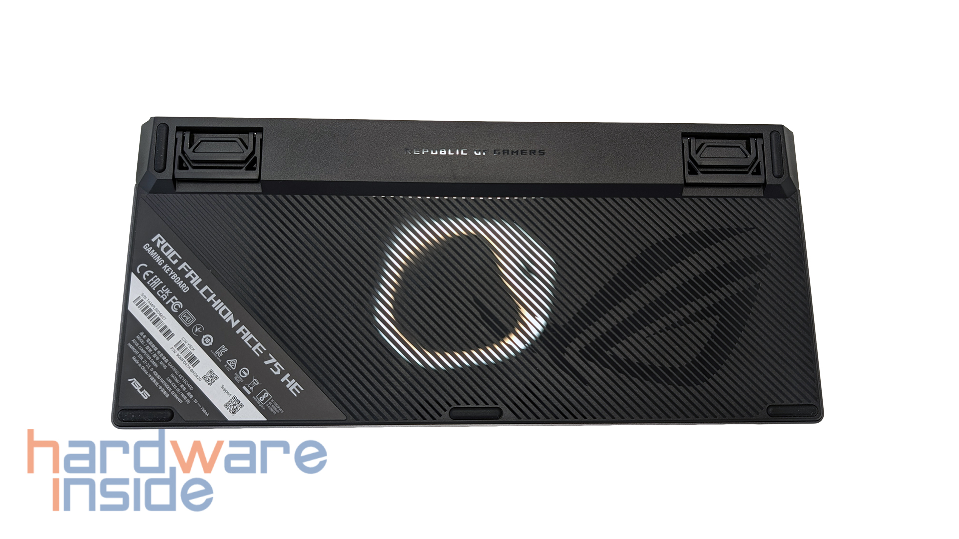 Auch die Unterseite der ASUS ROG Falchion Ace 75 HE ist nicht lieblos gestaltet, sondern fügt sich sauber in den insgesamt hochwertigen Eindruck der Tastatur ein. Während die Oberseite mit einer Aluminium-Top-Plate ausgestattet ist, präsentiert sich die Unterseite klassischer mit einer geriffelten Struktur, die die Fläche optisch auflockert. Auf der rechten Seite ist zudem ein eingelassenes ROG-Logo zu finden, das die Unterseite dezent aufwertet, ohne aufdringlich zu wirken. Insgesamt bleibt die Gestaltung somit funktional und orientiert sich dennoch klar an der typischen ROG-Optik.