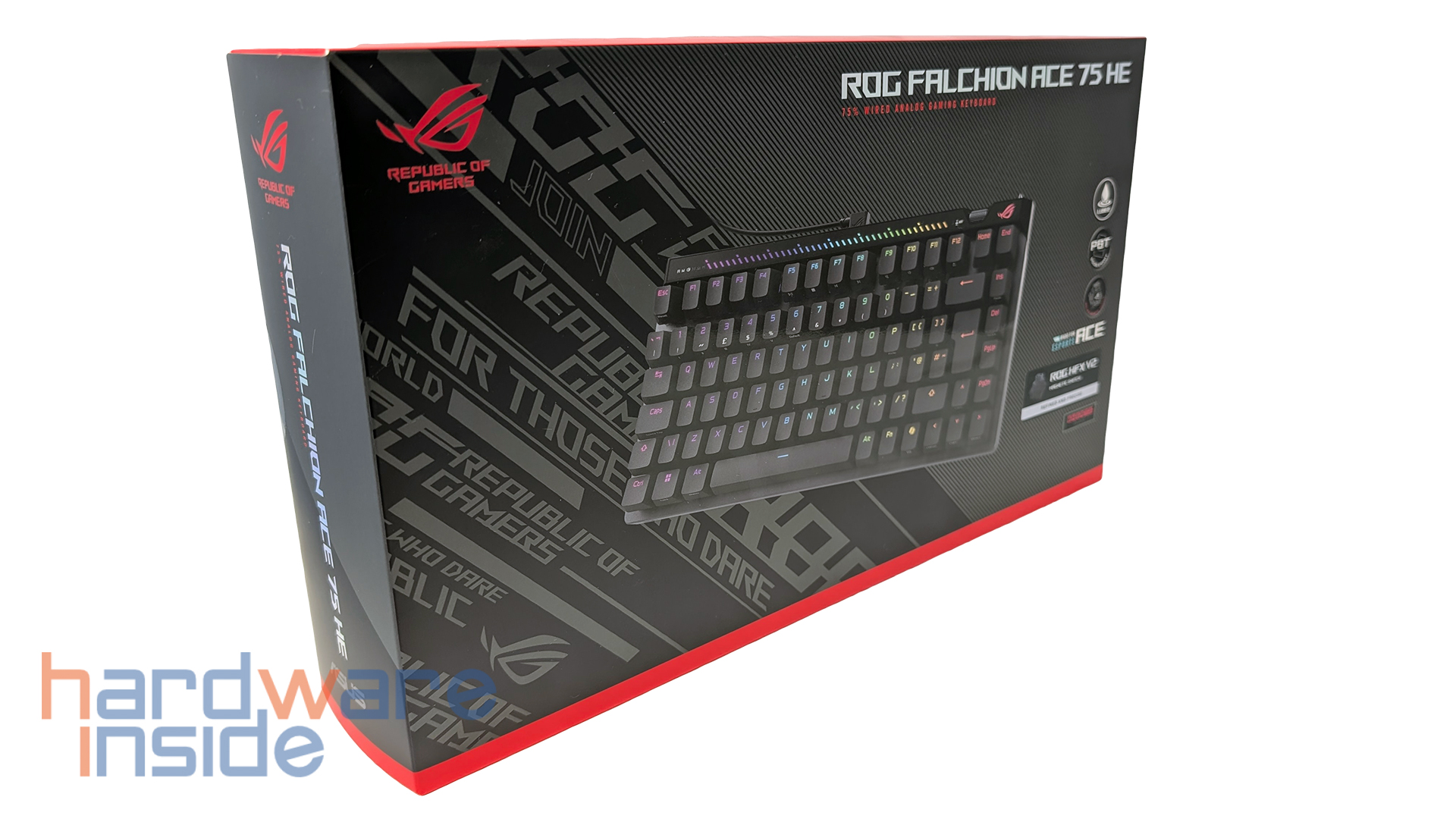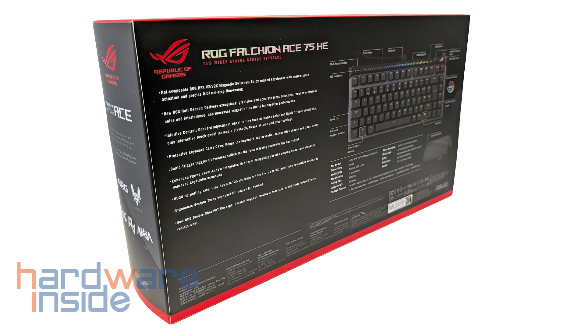 Schon die Verpackung der ASUS ROG Falchion Ace 75 HE macht einen hochwertigen Eindruck und positioniert die Tastatur eindeutig im gehobenen Gaming-Segment. ASUS setzt auf die bekannte ROG-Optik mit markanter Gestaltung, die sofort deutlich macht, an welche Zielgruppe sich das Modell richtet. Dabei geht es nicht nur um das äußere Design, sondern auch darum, die wichtigsten Eigenschaften bereits auf der Verpackung sichtbar hervorzuheben. So erhält man bereits vor dem Auspacken einen guten Eindruck davon, was die Tastatur technisch zu bieten hat. Features wie das kompakte 75%-Layout, die ROG HFX V2 Magnetic Switches, die 8000-Hz-Polling-Rate sowie Rapid Trigger und Speed Tap unterstreichen den klaren Fokus auf schnelle Eingaben und kompetitives Gaming.