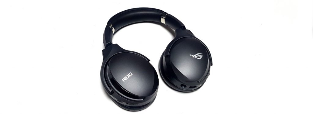Die wuchtigen Treibergehäuse sind ebenfalls aus Kunststoff gefertigt und sind an der Vorderseite angeschrägt. Auf dem linken Gehäuse ist der ROG Schriftzug in Weiß aufgedruckt und auf der rechten Seite ist ein ROG-Logo zu sehen.