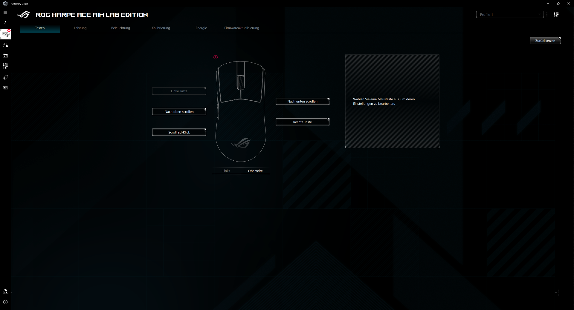 Zum Betreiben der ASUS ROG HARPE ACE in der AIM LAB Edition empfehlen wir die Installation der Software namens Amoury Crate. Verbinden wir die Maus mit unserem System, so wird uns diese im Menü der Software angezeigt. Insgesamt finden wir sechs Registerkarten zu Maus vor, in der ersten geht es um die Tasten der Maus, welche sich hier mit Funktionen oder Markos belegen lassen.