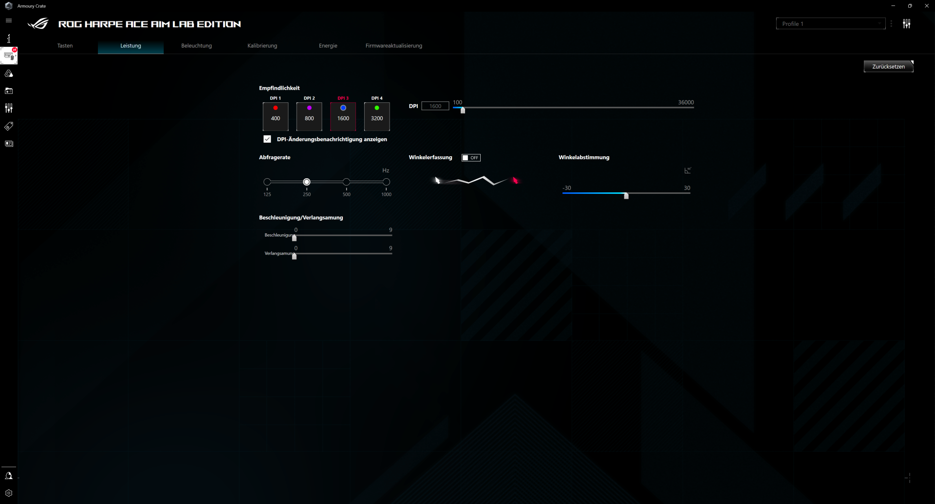 In der nächsten Registerkarte können wir Einstellungen zur Maus vornehmen. Hier können wir vier Stufen für die Auflösung des Sensors festlegen, die Auflösung wird durch einen Schieberegler eingestellt. Anschließend zeigt die Maus über die LED im Mausrad an, welche DPI-Stufe gerade ausgewählt ist. Zudem zeigt die Software beim Wechseln der DPI-Stufe auch auf dem Monitor an, welche Stufe gerade ausgewählt wurde. Weiter lassen sich Abfragerate, Beschleunigung sowie Einstellungen zur Winkelerfassung und Winkelabstimmung anpassen.