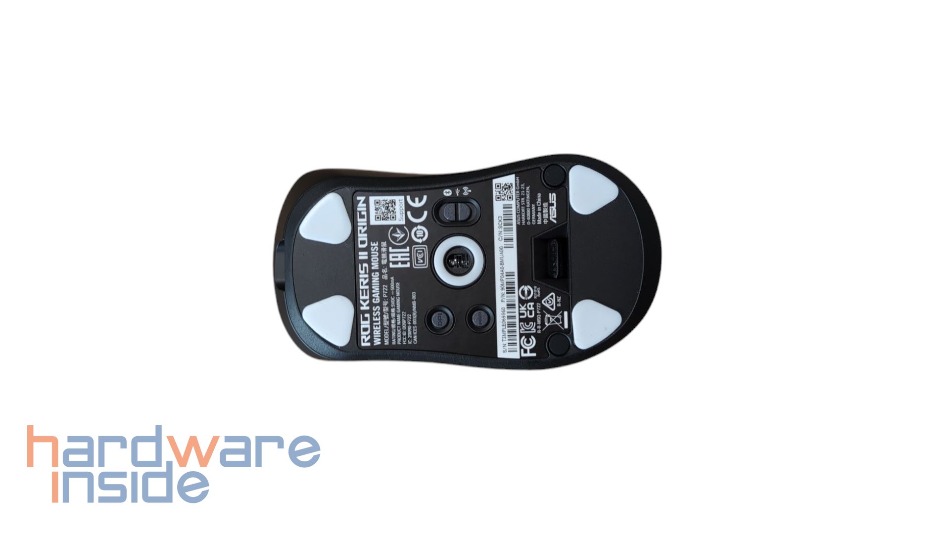 Weiter geht es auf der Unterseite der ROG Keris II Origin-Maus. Dort können wir fünf Gleitpads sehen, vier davon sind an den Ecken vorzufinden und eine, welche den Sensor umschließt. Im hinteren Teil ist der USB-Dongle in einem kleinen Fach versteckt, welcher hier magnetisch haftet. Mit dem Schalter, der sich rechts vom Sensor befindet, können wir eine von drei Verbindungsarten (Bluetooth, Kabel oder Funk) auswählen. Links vom Sensor sind zwei Knöpfe platziert. Der Obere ist für die vier DPI Einstellungen und der Untere wird für das Pairing benötigt, um eine Wireless-Verbindung herzustellen.