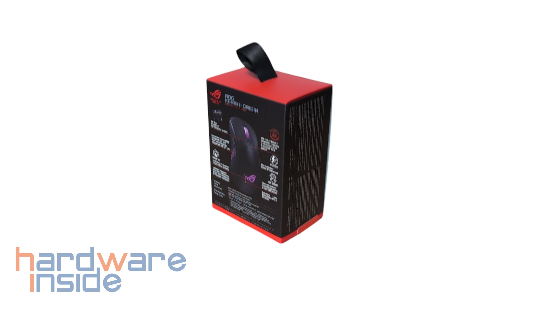 Die ASUS ROG Keris II Origin kommt in einer Verpackung aus Karton, bei der die Farben Schwarz und Rot dominieren. Die Vorderseite zeigt eine Abbildung der Maus, das Herstellerlogo, die Modellbezeichnung sowie einige Features. Auf der Rückseite ist eine weitere Abbildung der Maus zu sehen sowie die wichtigsten Merkmale in Kurzform. Die technischen Daten sind auf der linken Seite der Verpackung aufgeführt.