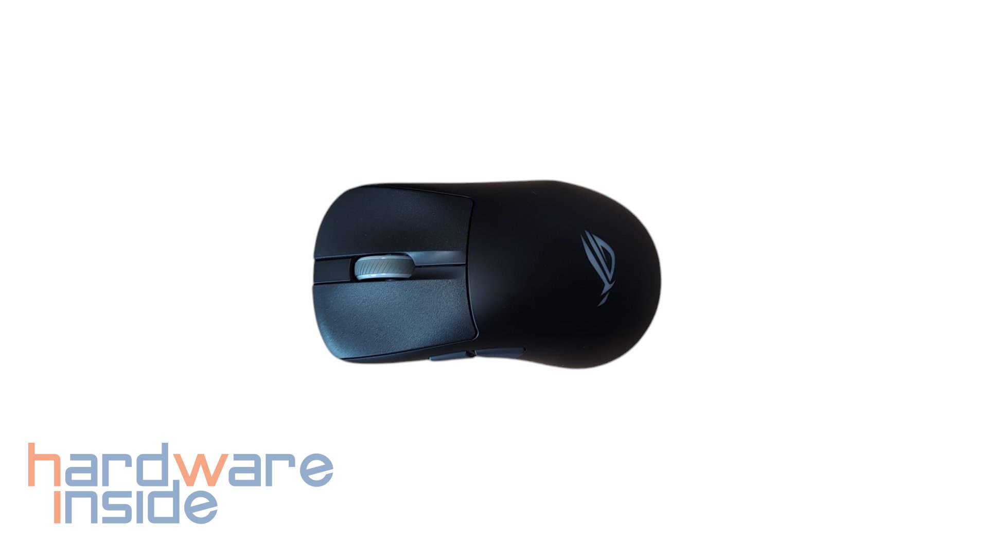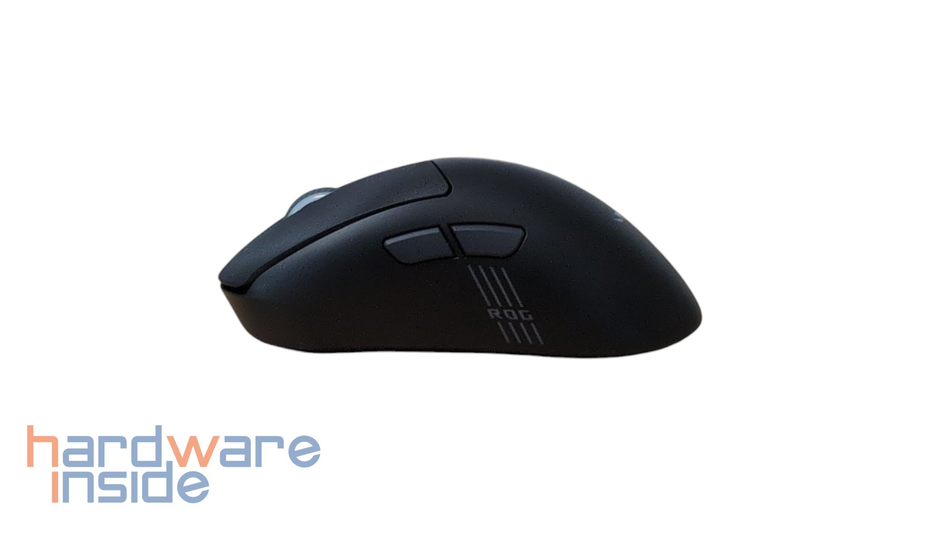 An der linken Seite sind zwei Daumentasten vorhanden, diese setzen sich durch das grau farblich von der Maus ab. Darunter befinden sich ein ROG-Schriftzug sowie vier diagonale Streifen, die ebenfalls beleuchtet sind. Da es sich um eine Maus für Rechtshänder handelt, fällt die rechte Seite etwas flacher ab, um so dem Ring- und kleinem Finger mehr halt zu bieten.