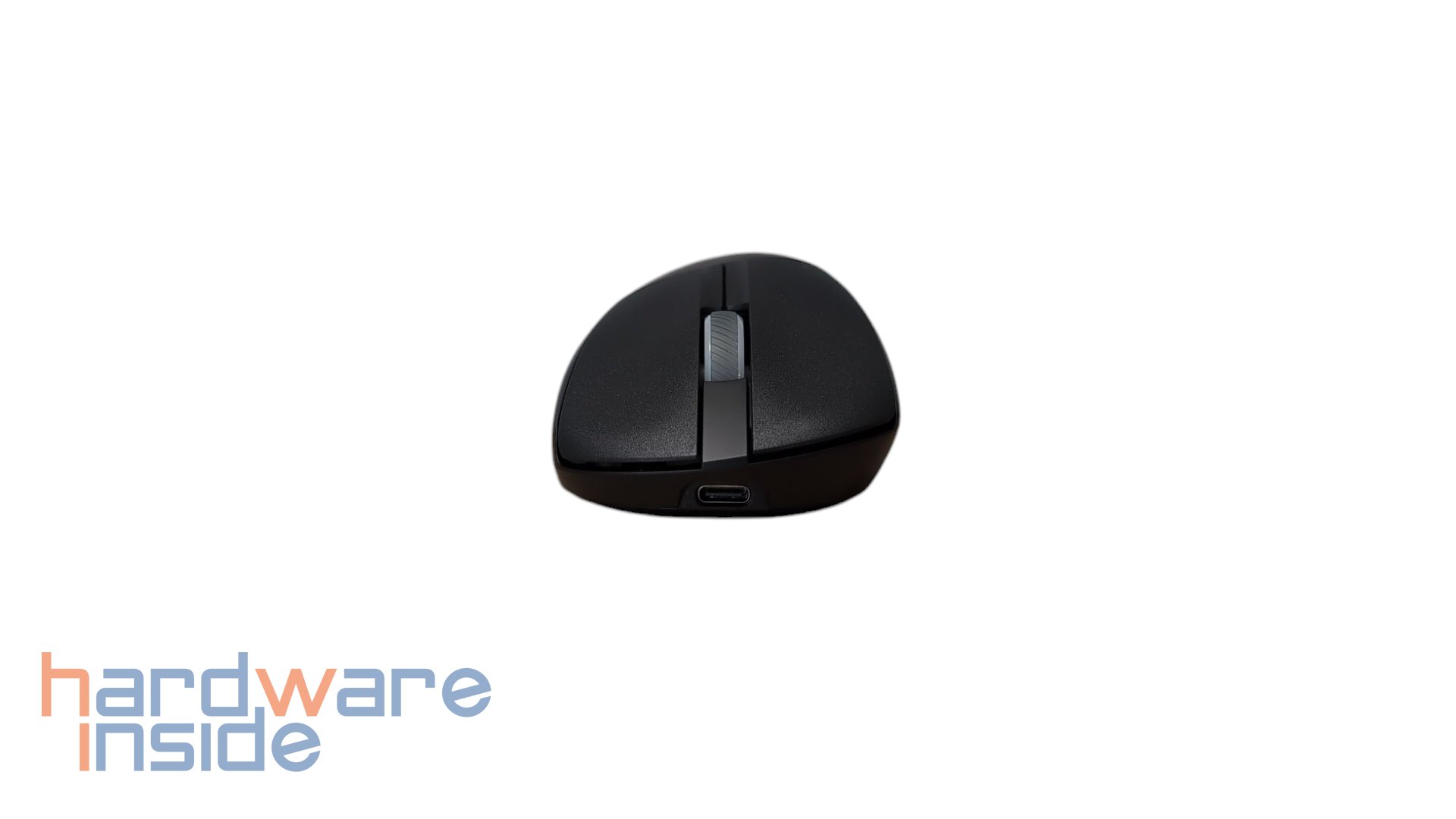 In der Ansicht von vorne ist gut zu erkennen, wie die Maus nach rechts abfällt. Dies verdeutlicht die Ergonomie für Rechtshänder. An der Front sitzt ein USB-C-Anschluss, mit dem die Maus geladen oder mit Kabel betrieben werden kann. Hinten sehen wir noch einmal das zuvor erwähnte beleuchtete Logo.