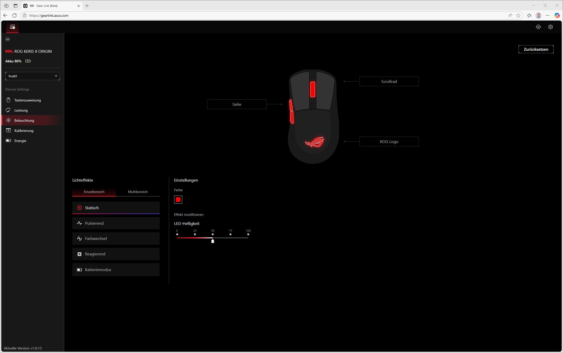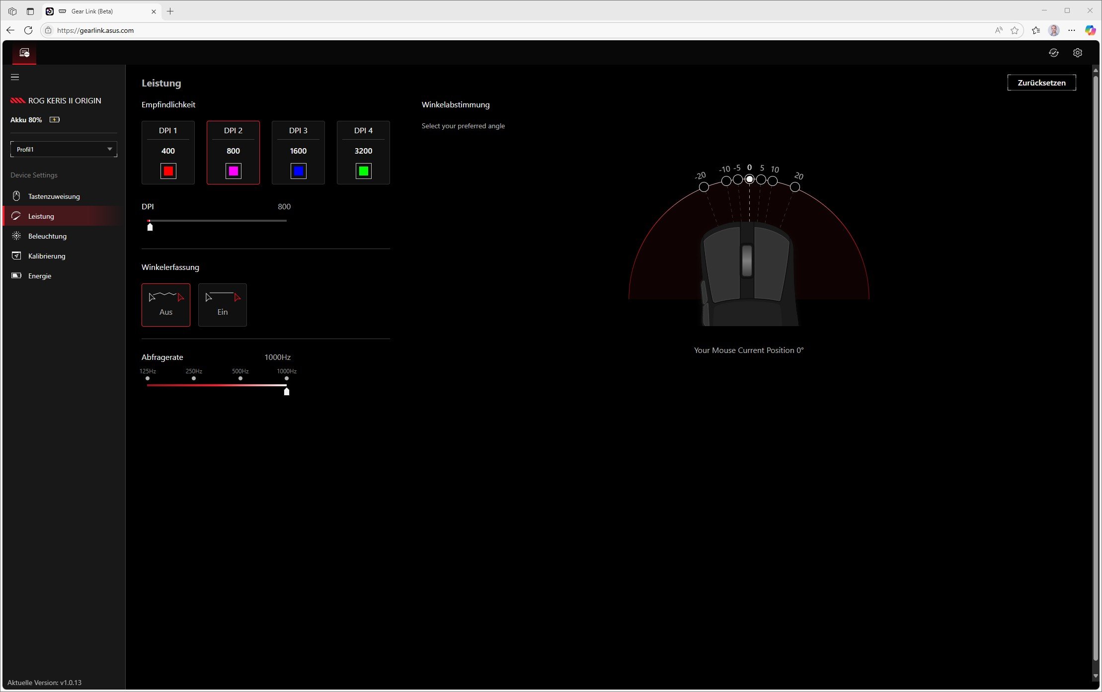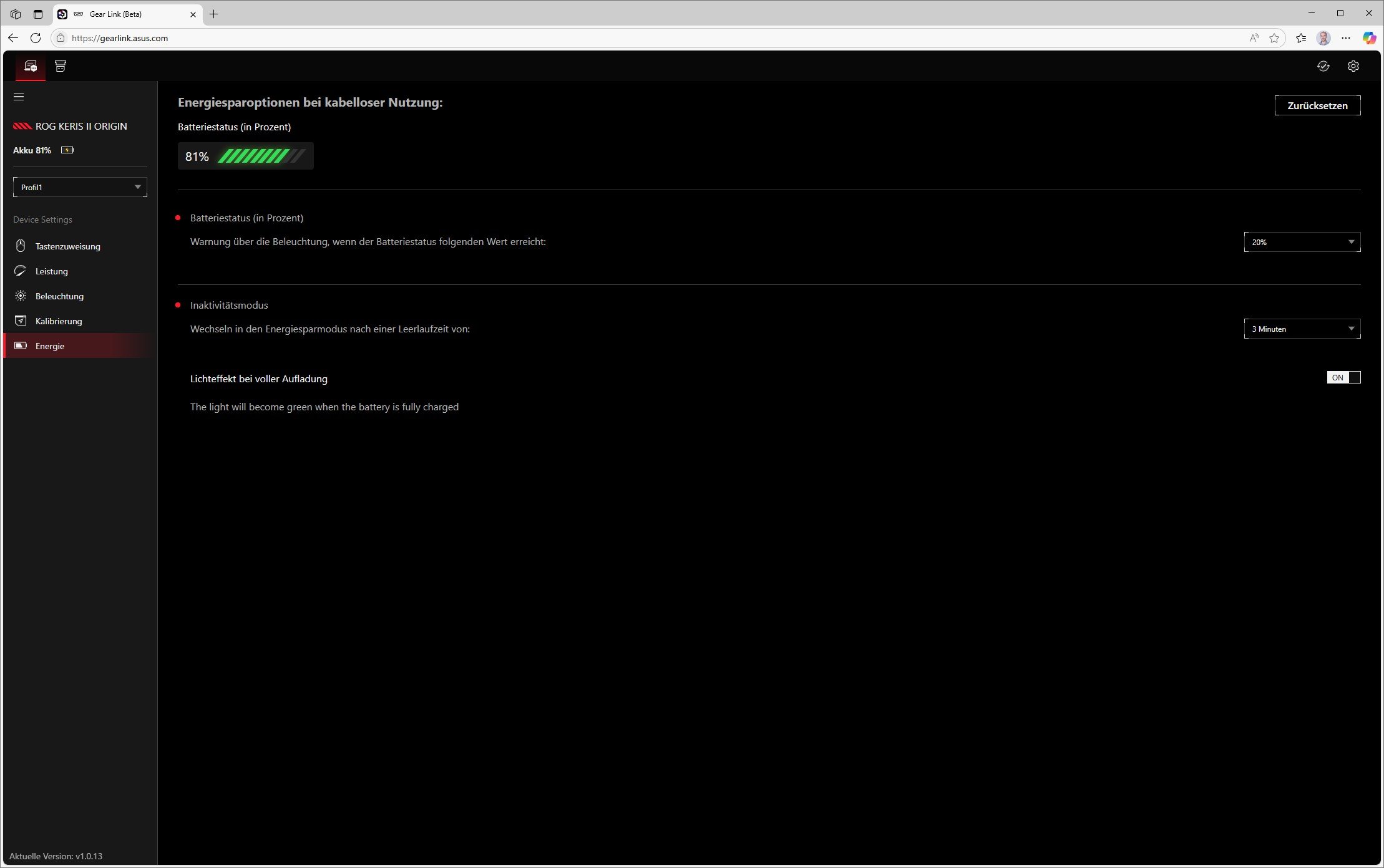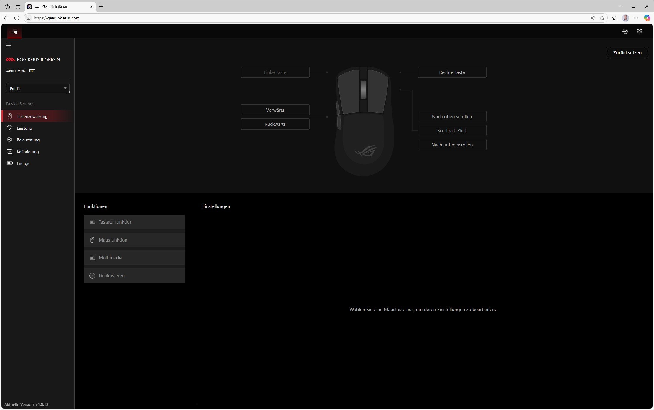 Wer wie wir die Webseite nutzt, muss lediglich auf den Connect-Button klicken und dann die Maus auswählen. Ist dies geschehen, ist links ein Reiter zu sehen, der den Namen der Maus trägt. Dort werden der Akkustand, die Profilauswahl, Tastenzuweisung, Leistung, Beleuchtung, Kalibrierung und die Energie angezeigt. Unter dem Reiter Tastenzuweisung, können den diversen Tasten der Maus, Funktionen von Tastatur, Maus und Multimedia zugewiesen werden. Ein Deaktivieren der Tasten ist ebenfalls möglich.