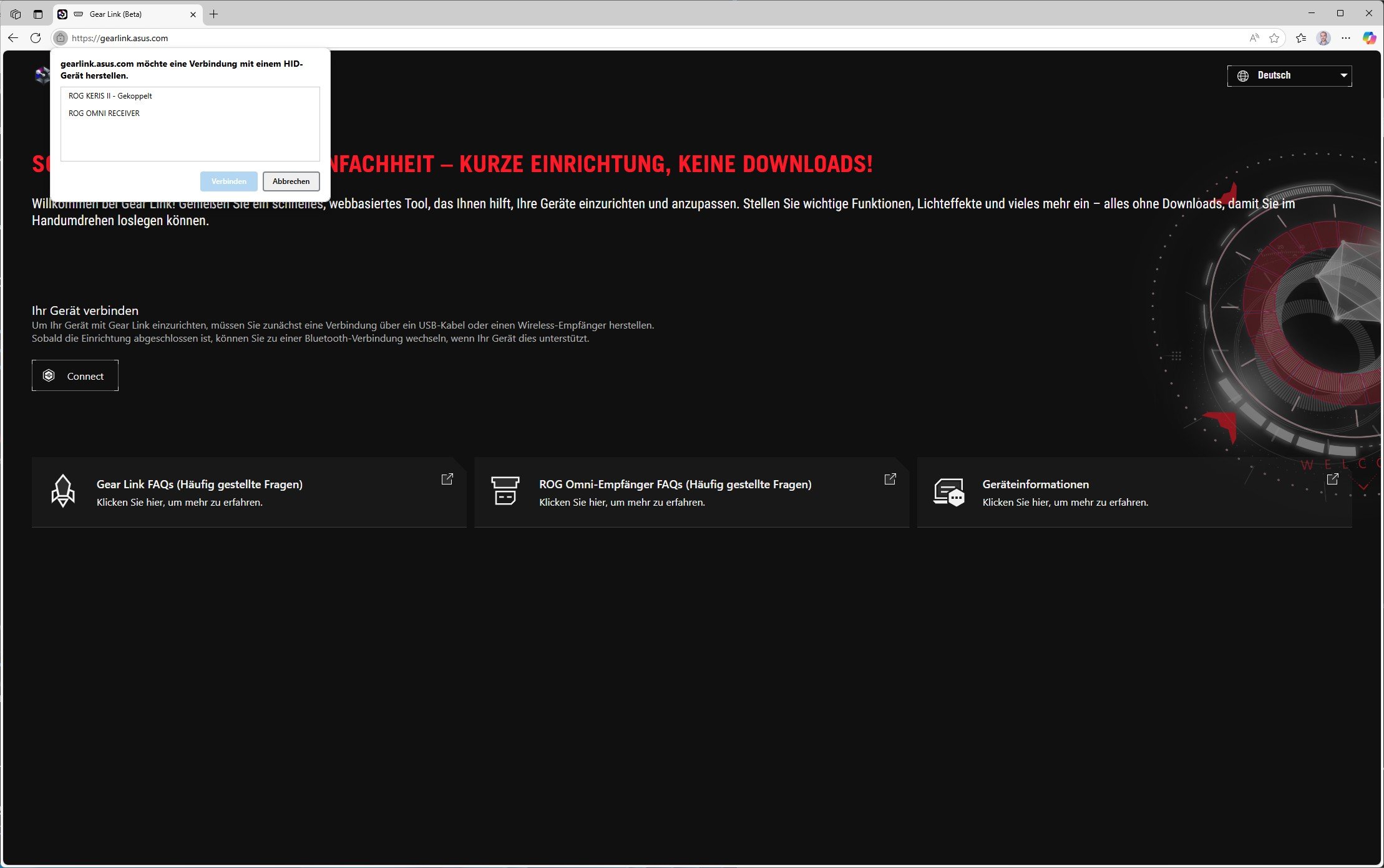 Zur Inbetriebnahme ist nichts Wirkliches zu beachten, jedoch sollte man die ASUS ROG Keris II Origin-Maus allerdings vor der ersten Nutzung vollständig aufladen. Anschließend kann der Funkempfänger eingesteckt werden und an der Maus auf den Funk-Modus gewechselt werden. Nach Betätigung des Pair-Buttons auf der Unterseite der Maus ist die Verbindung in binnen weniger Sekunden hergestellt. Damit ist die Maus einsatzbereit. Die Software ist nicht zwingend notwendig. Wer alle Möglichkeiten nutzen möchte, kann entweder die Software Armoury Crate oder die Webseite Gear Link nutzen.